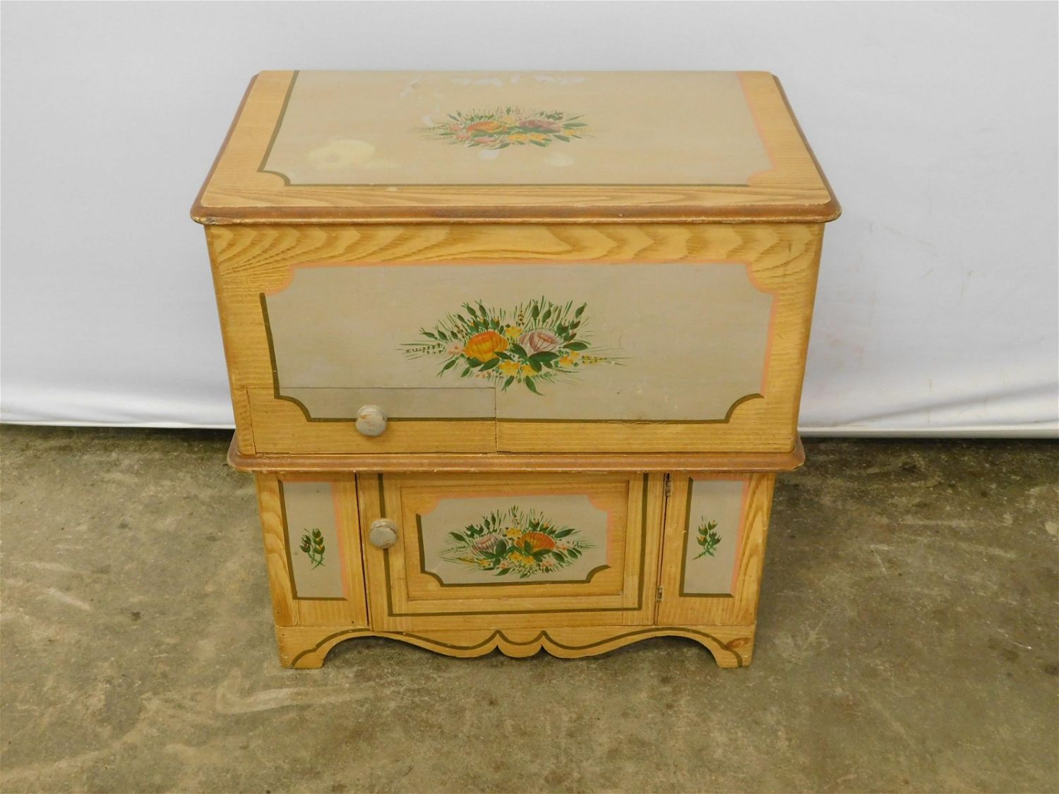 19th c hand painted country cottage flip top blanket chest. Has painted grain accents. Measures approx. 30" t x 28" l x 17" d. All invoices must be paid for within 24 hours. We offer multiple shipping options, please read the terms as they have changed. We also offer pick ups on Friday, Saturday and Monday immediately following the sale BY APPOINTMENT ONLY. PLEASE READ THE TERMS!!!