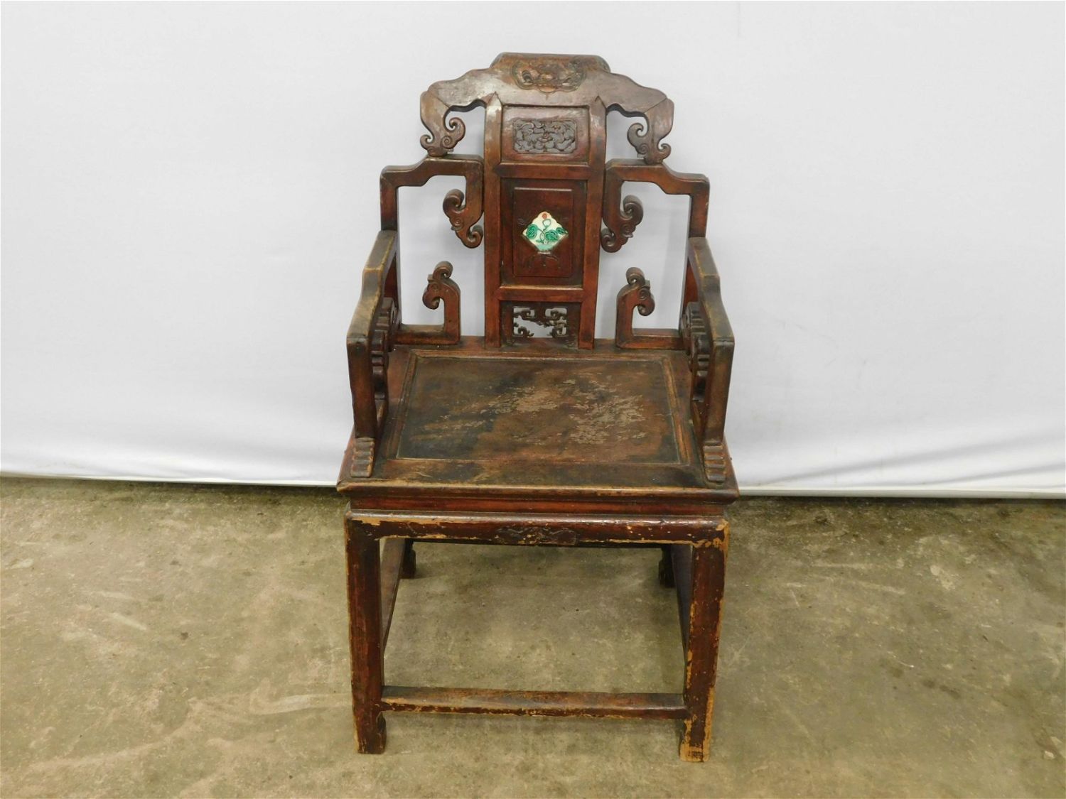 Carved Oriental arm chair with dragon motif. Has significant wear and water damage to the seat. Measures approx. 41" t x 24" l x 19" d. All invoices must be paid for within 24 hours. We offer multiple shipping options, please read the terms as they have changed. We also offer pick ups on Friday, Saturday and Monday immediately following the sale BY APPOINTMENT ONLY. PLEASE READ THE TERMS!!!