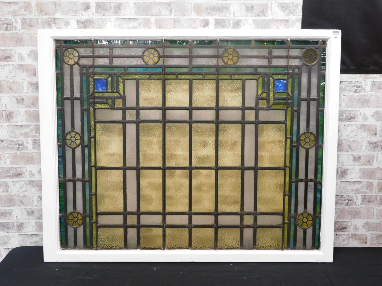 Oversized stained glass window in an arts and crafts style, in very good condition. Measures approx. 40" t x 50 1/2" l x 2" d. All invoices must be paid for within 24 hours. We offer multiple shipping options, please read the terms as they have changed. We also offer pick ups on Friday, Saturday and Monday immediately following the sale BY APPOINTMENT ONLY. PLEASE READ THE TERMS!!!