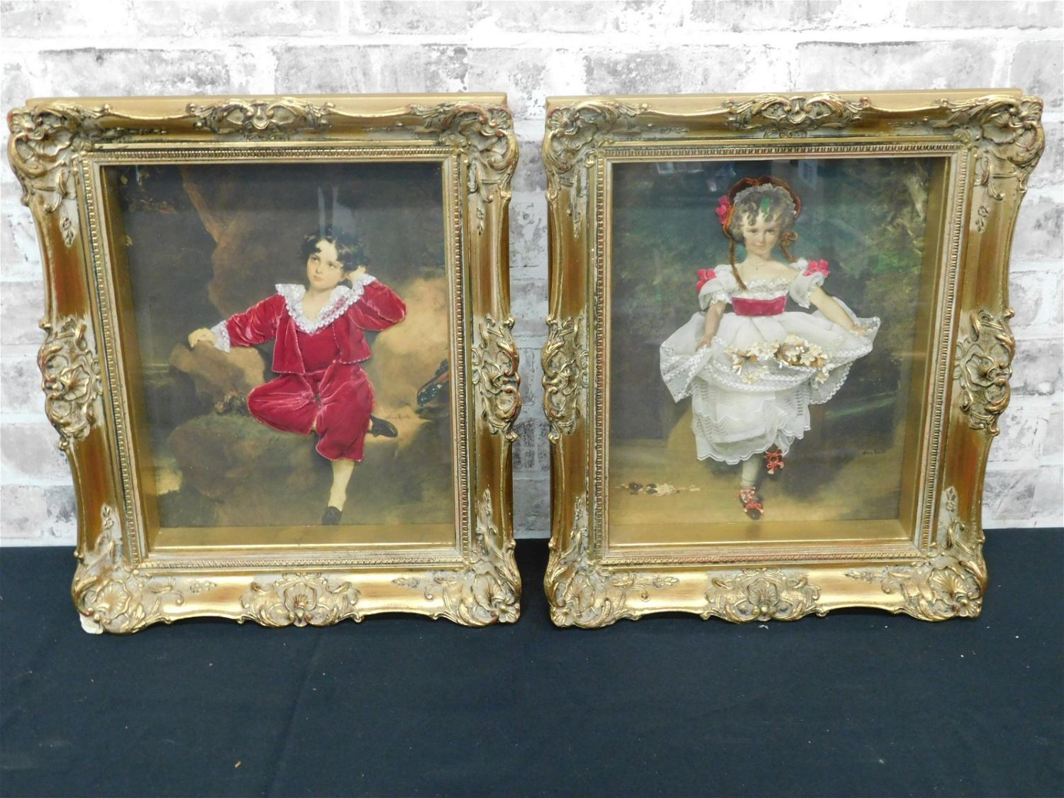 Pair of framed portrait prints in shadow box with 3 dimensional clothed bodies. Frame has minor chipping. Measures approx. 17" t x 14 1/2" w x 2" d. All invoices must be paid for within 24 hours. We offer multiple shipping options, please read the terms as they have changed. We also offer pick ups on Friday, Saturday and Monday immediately following the sale BY APPOINTMENT ONLY. PLEASE READ THE TERMS!!!