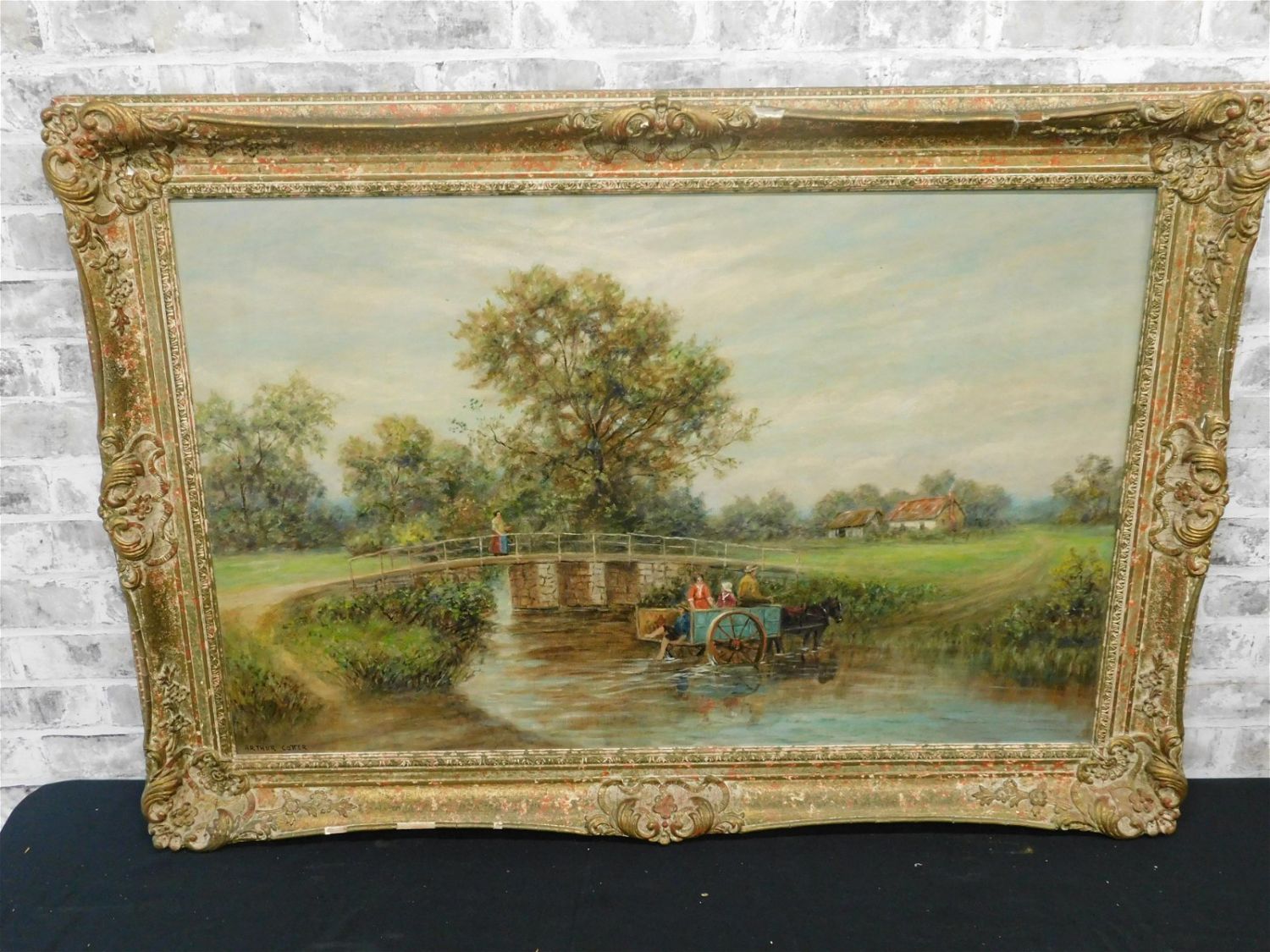 Oil on canvas by Arthur Cotter depicting a countryside bridge scene over a stream with a wagon. Frame has loss throughout. Measures approx. 31 1/2" t x 43" l x 2" d. All invoices must be paid for within 24 hours. We offer multiple shipping options, please read the terms as they have changed. We also offer pick ups on Friday, Saturday and Monday immediately following the sale BY APPOINTMENT ONLY. PLEASE READ THE TERMS!!!