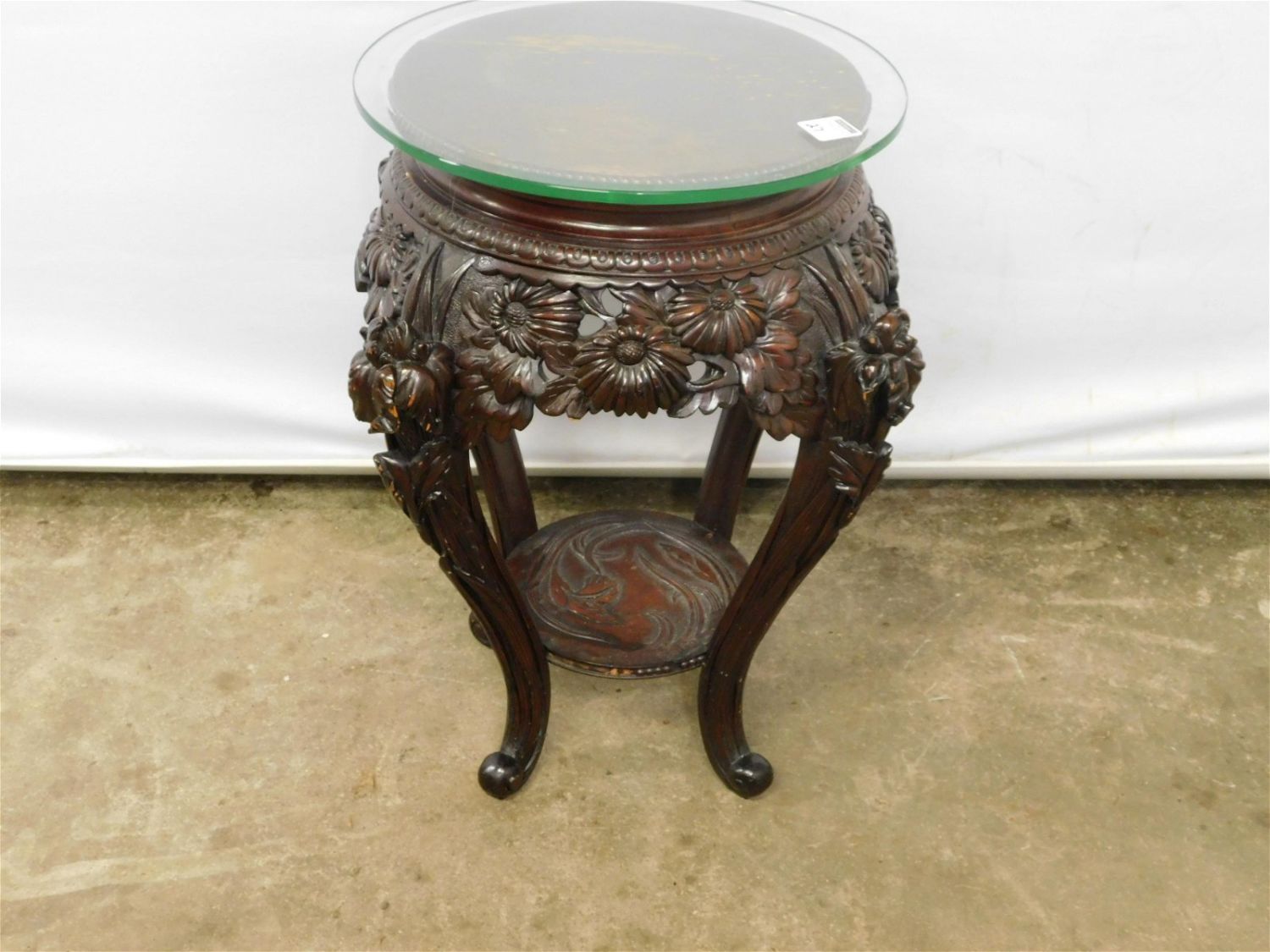 Hand Carved art nouveau Fern Stand. Has flower decoration. Top has water damage but has glass top to compensate. Measures 28" tall x 27" diameter. All invoices must be paid within 24 hours of the sale. All items are local pick up or UPS shipping and will be billed separately. PLEASE READ THE TERMS. Local pickups are at our Monmouth Junction location on Thursday, Friday, Saturday and Monday ONLY! All pickups are by appointment only. Any condition issues will be listed in the description. Please read the terms for full information.