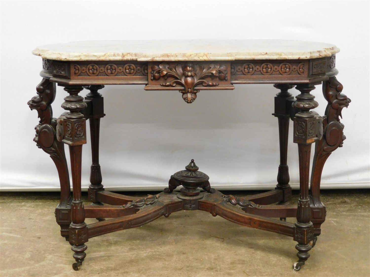 Victorian Marble Top Console/Parlor Table. Heavily Carved with Griffin Decorations. Has molding missing throughout. Overall good condition. Measures 29" tall x 42" wide x 27" deep. All invoices must be paid within 24 hours of the sale. All items are local pick up or UPS shipping and will be billed separately. PLEASE READ THE TERMS. Local pickups are at our Monmouth Junction location on Thursday, Friday, Saturday and Monday ONLY! All pickups are by appointment only. Any condition issues will be listed in the description. Please read the terms for full information.