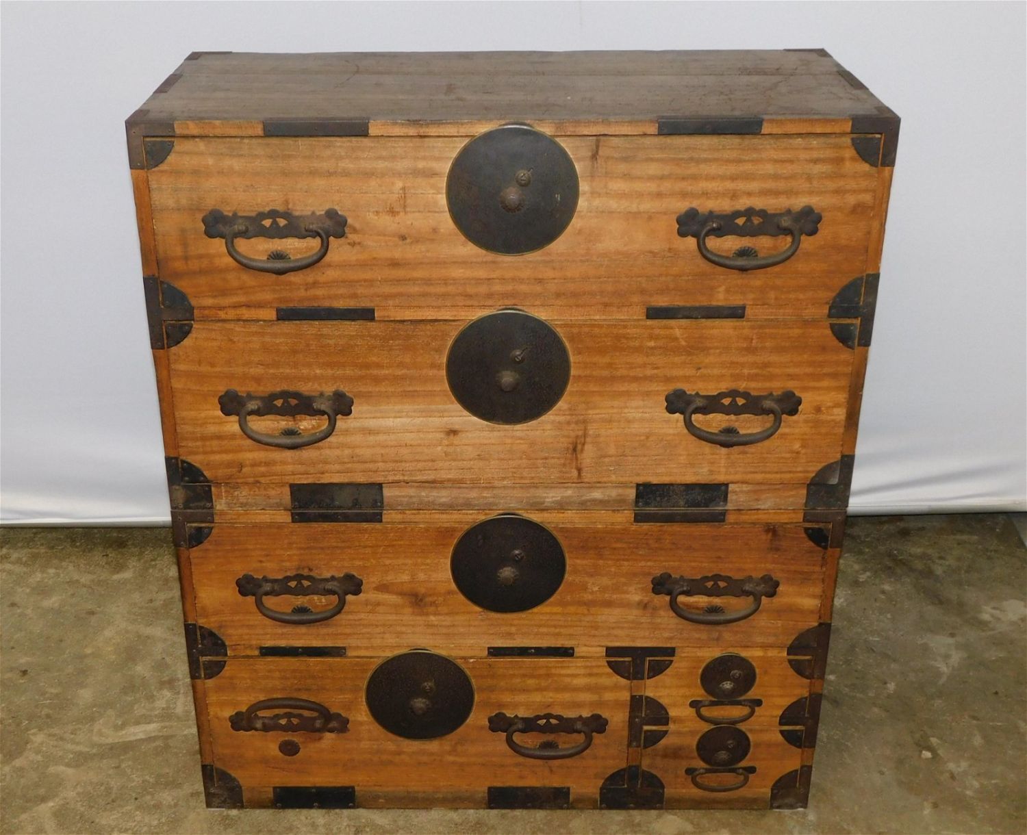 Asian influenced chest on chest with iron handles. Measures approx. 42" t x 37" l x 17" d. All invoices must be paid for within 24 hours. We offer multiple shipping options, please read the terms as they have changed. We also offer pick ups on Friday, Saturday and Monday immediately following the sale BY APPOINTMENT ONLY. PLEASE READ THE TERMS!!!