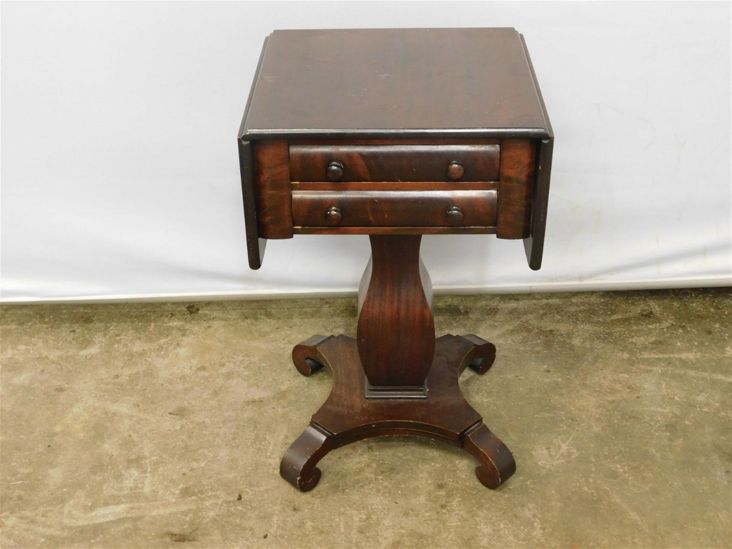 Empire mahogany 2 drawer drop leaf side table/work table. Top has some scratching. Measures approx. 28" t x 17" l with 2 9" drops x 17" d. All invoices must be paid for within 24 hours. We offer multiple shipping options, please read the terms as they have changed. We also offer pick ups on Friday, Saturday and Monday immediately following the sale BY APPOINTMENT ONLY. PLEASE READ THE TERMS!!!