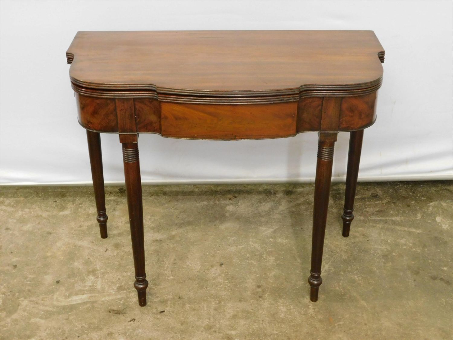19th c mahogany flip top table. Measures approx. 30" t x 36" l x18 1/2" d. All invoices must be paid for within 24 hours. We offer multiple shipping options, please read the terms as they have changed. We also offer pick ups on Friday, Saturday and Monday immediately following the sale BY APPOINTMENT ONLY. PLEASE READ THE TERMS!!!