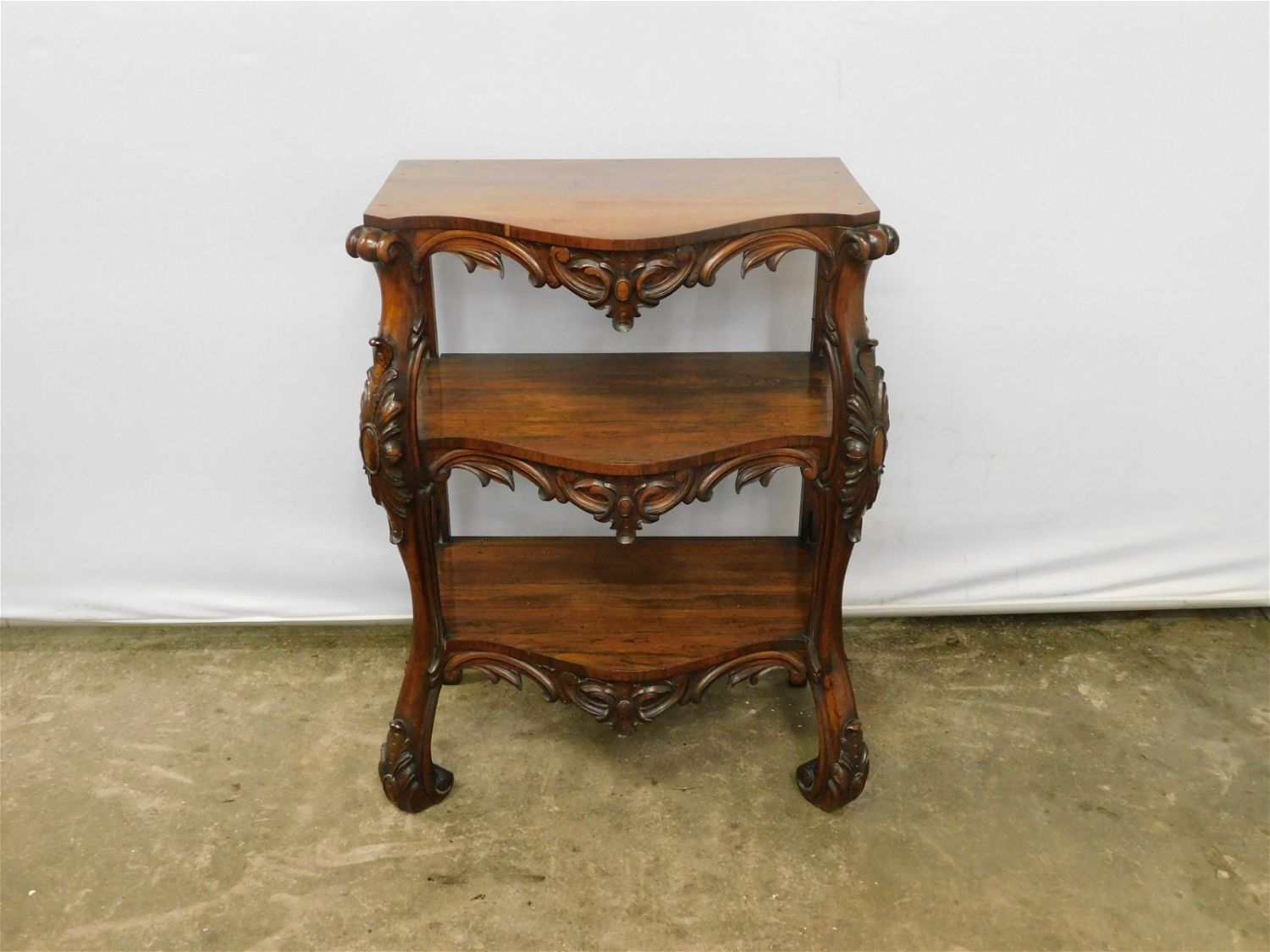 Mahogany/rosewood Victorian heavily carved 3 tier shelf/etagere. Has minor veneer loss. Originally had a gallery top. Measures approx. 38" t x 29" l x 18" d. All invoices must be paid for within 24 hours. We offer multiple shipping options, please read the terms as they have changed. We also offer pick ups on Friday, Saturday and Monday immediately following the sale BY APPOINTMENT ONLY. PLEASE READ THE TERMS!!!
