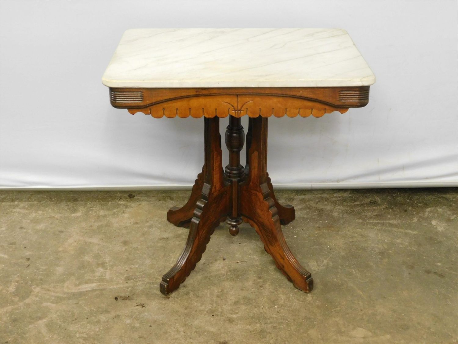 Victorian marble top side table/plant stand. Marble has chipping on one side but does not affect the top. Measures approx. 29" t x 30" l x 22" d. All invoices must be paid for within 24 hours. We offer multiple shipping options, please read the terms as they have changed. We also offer pick ups on Friday, Saturday and Monday immediately following the sale BY APPOINTMENT ONLY. PLEASE READ THE TERMS!!!