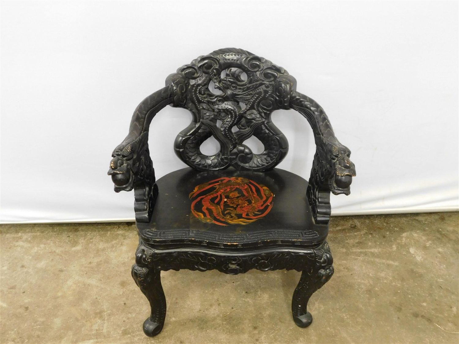 Hand carved Chinese arm chair with dragon motif and hand painted seat. Measures approx. 33" t x 26" l x 18" d. All invoices must be paid for within 24 hours. We offer multiple shipping options, please read the terms as they have changed. We also offer pick ups on Friday, Saturday and Monday immediately following the sale BY APPOINTMENT ONLY. PLEASE READ THE TERMS!!!