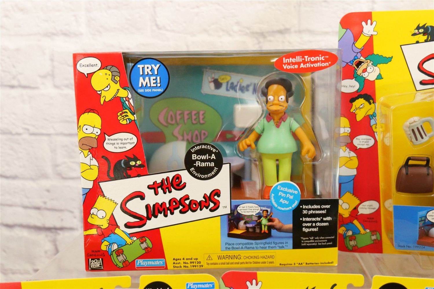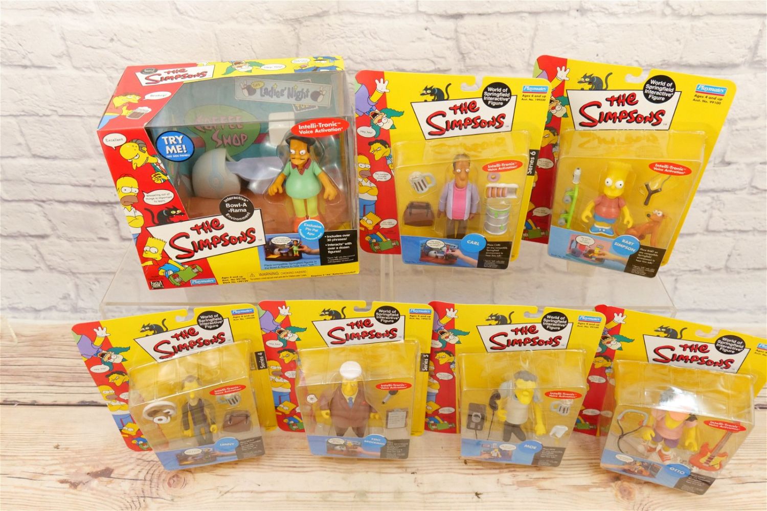 Lot of The Simpsons Interactive Figures by Playmates including Interactive Bowl-A-Rama Environment, Bart Simpson, Otto, Moe, Kent Brockman, Lenny, and Carl. All new in packages. All invoices must be paid within 24 hours of the sale. We offer multiple shipping options, please read the terms as they have changed. We also offer Pick-Ups Friday, Saturday, and Monday immediately following the sale. BY APPOINTMENT ONLY. PLEASE READ THE NEW TERMS!!!