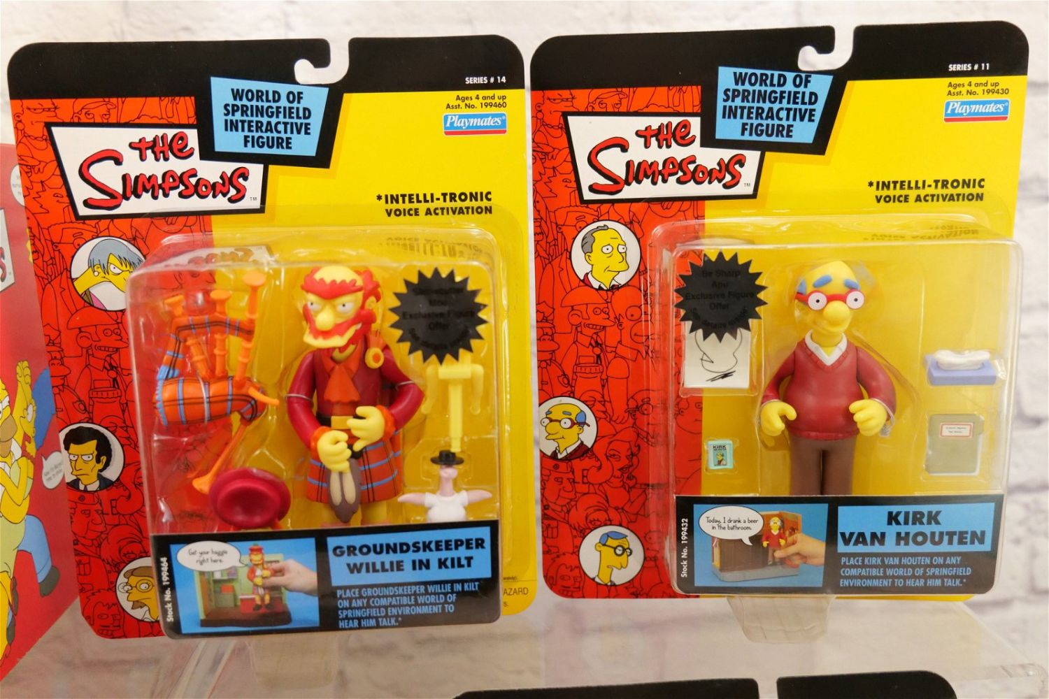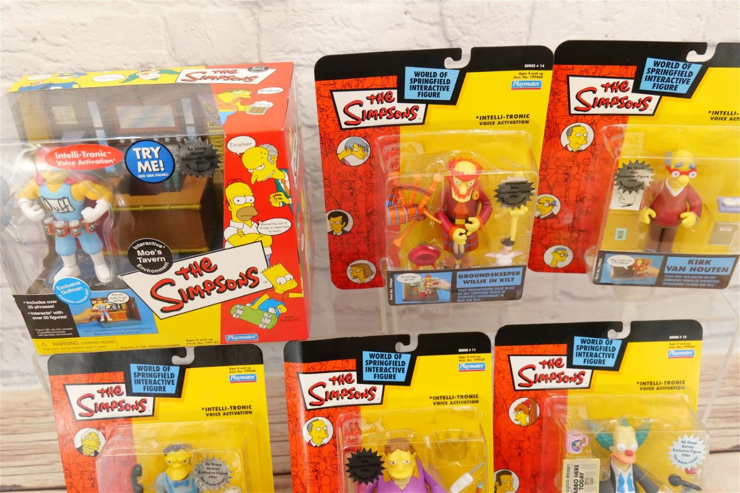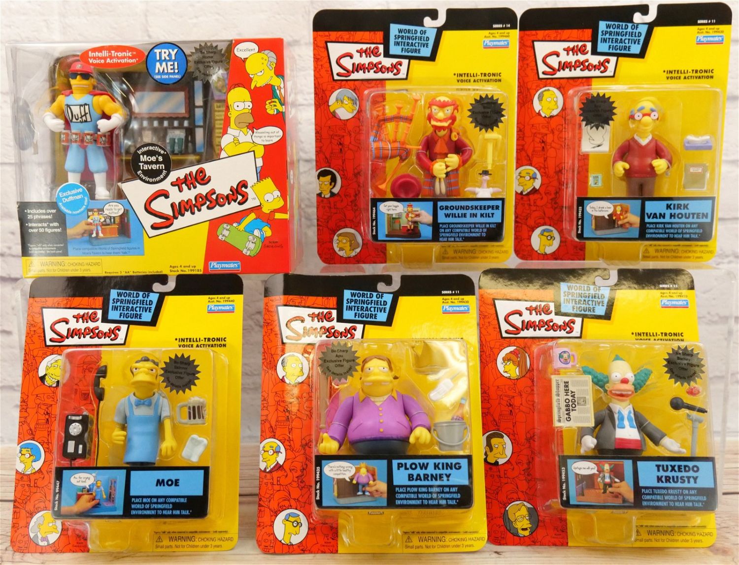 Lot of The Simpsons Interactive Figures by Playmates including Interactive Moe’s Tavern Environment, Tuxedo Krusty, Moe, Plow King Barney, Kirk Van Houten, and Groundskeeper Willie in Kilt. All new in packages. All invoices must be paid within 24 hours of the sale. We offer multiple shipping options, please read the terms as they have changed. We also offer Pick-Ups Friday, Saturday, and Monday immediately following the sale. BY APPOINTMENT ONLY. PLEASE READ THE NEW TERMS!!!