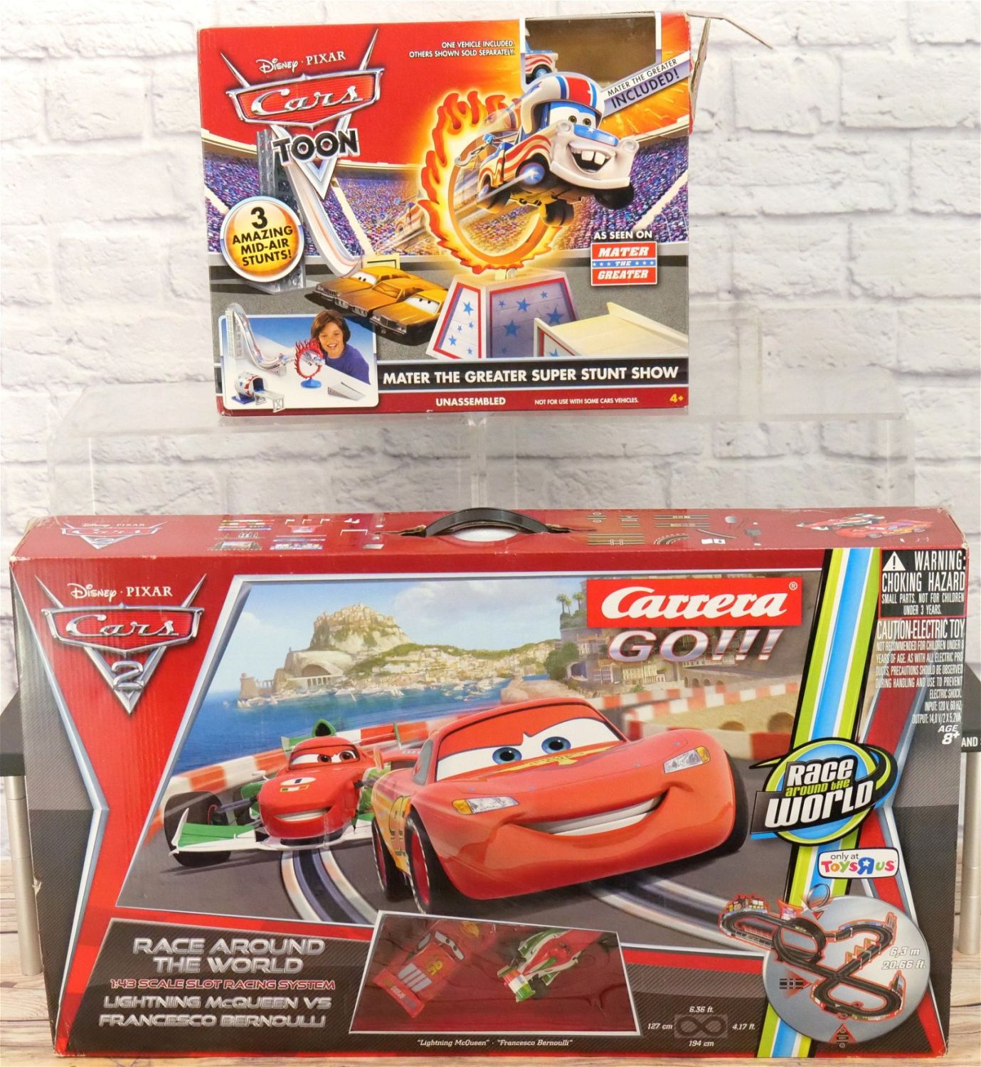 Lot of 2 Disney Pixar Cars Vehicle Sets including Cars Toon Mater the Greater Super Stunt Show – Box has been ripped open on the one side – Mater is included and Cars 2 – Race Around the World Slot Car Set by Carrera – New in Box. All invoices must be paid within 24 hours of the sale. We offer multiple shipping options, please read the terms as they have changed. We also offer Pick-Ups Friday, Saturday, and Monday immediately following the sale. BY APPOINTMENT ONLY. PLEASE READ THE NEW TERMS!!!