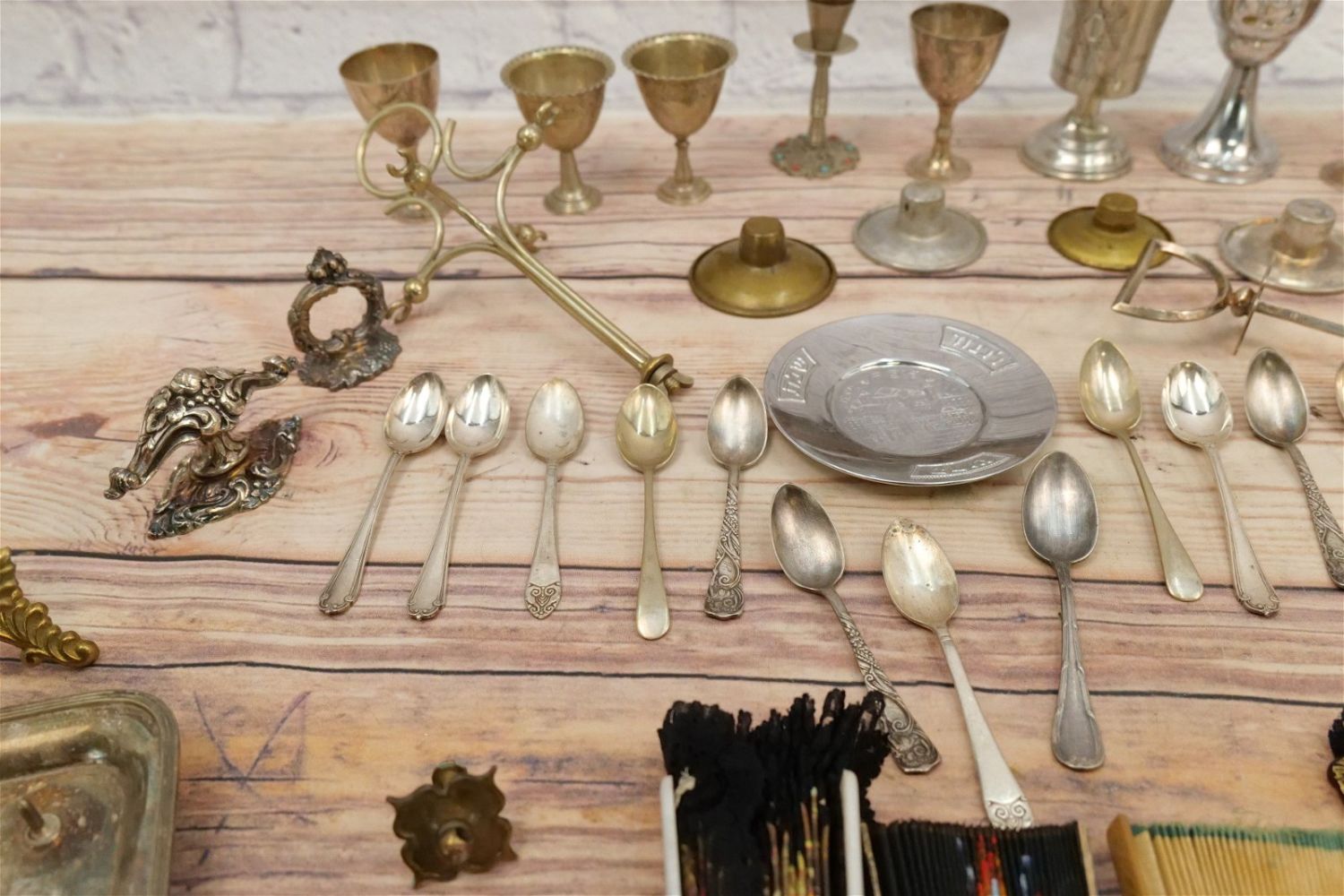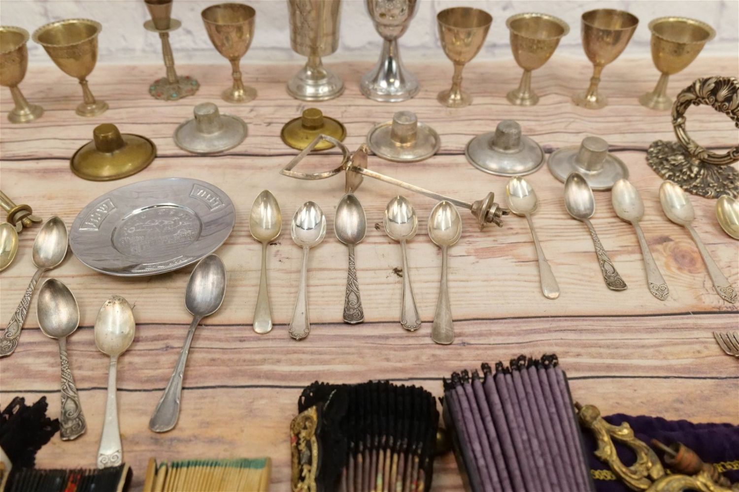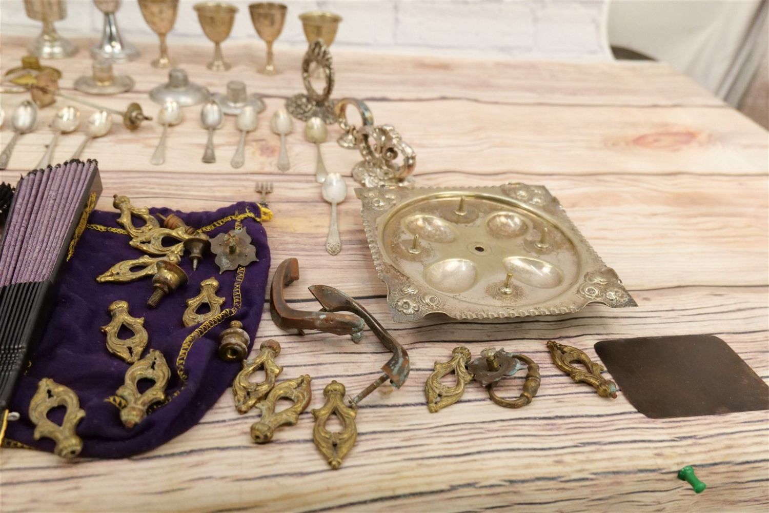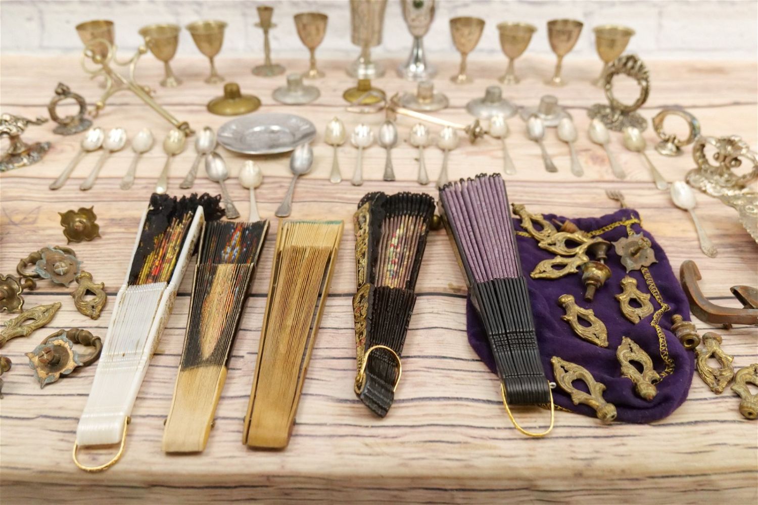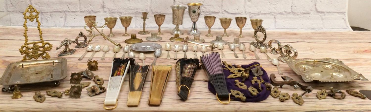 Lot of Silverplate, Hardware and Decorative Fans. Lot includes Silverplated Serving Tray Handles, Flatware, Cruet Set – Needs Restoration, Brass Draw Pulls, and (5) Decorative Fans. All invoices must be paid within 24 hours of the sale. We offer multiple shipping options, please read the terms as they have changed. We also offer Pick-Ups Friday, Saturday, and Monday immediately following the sale. BY APPOINTMENT ONLY. PLEASE READ THE NEW TERMS!!!