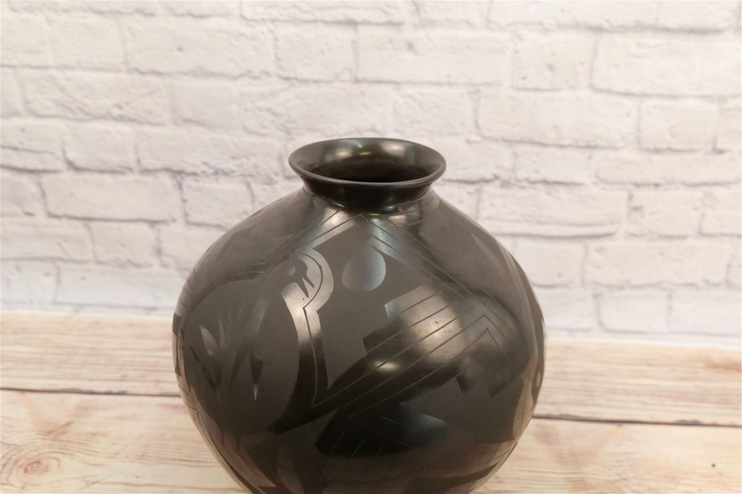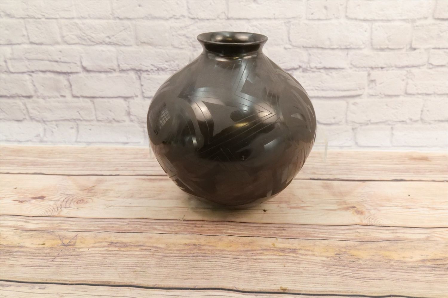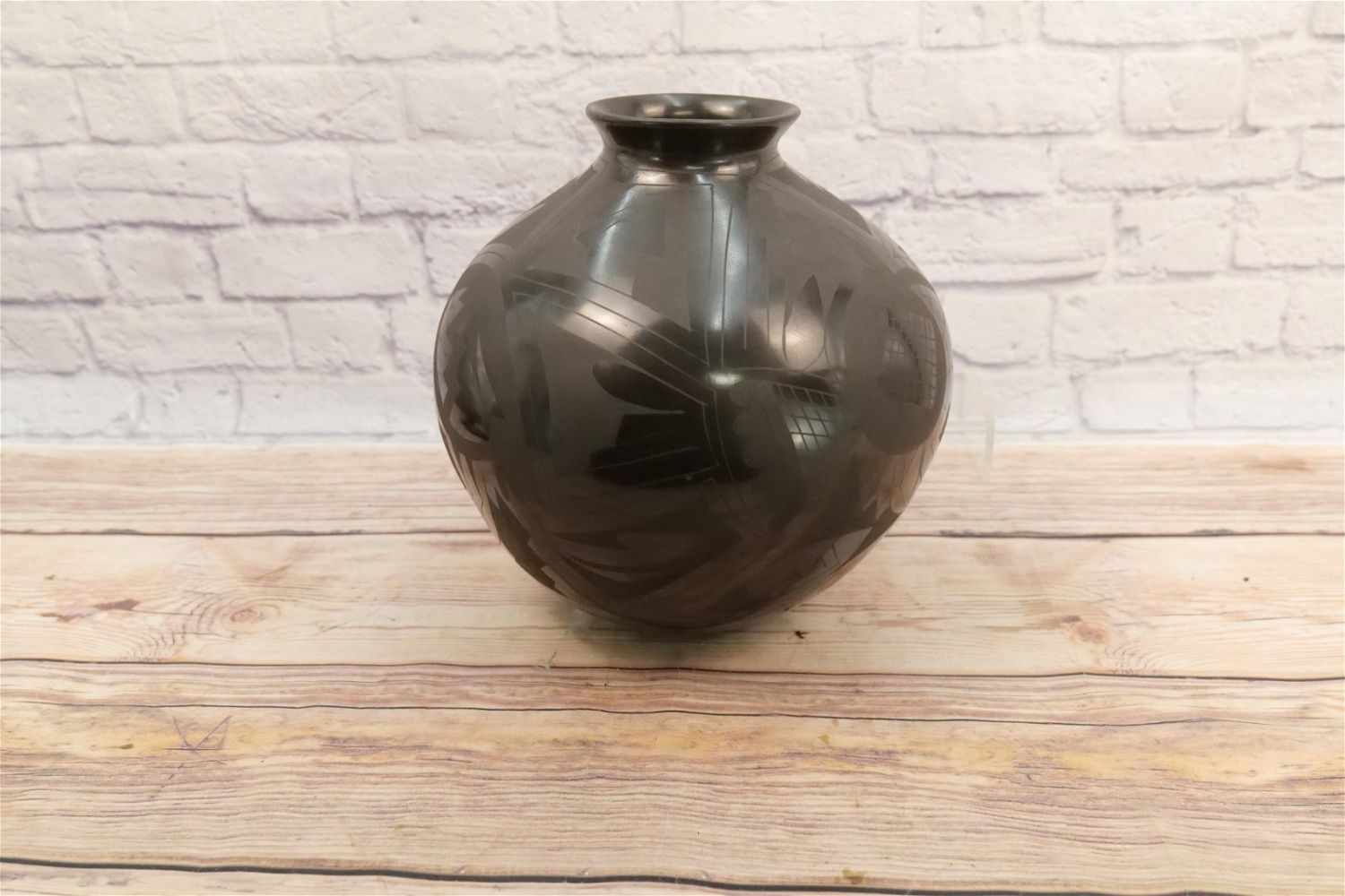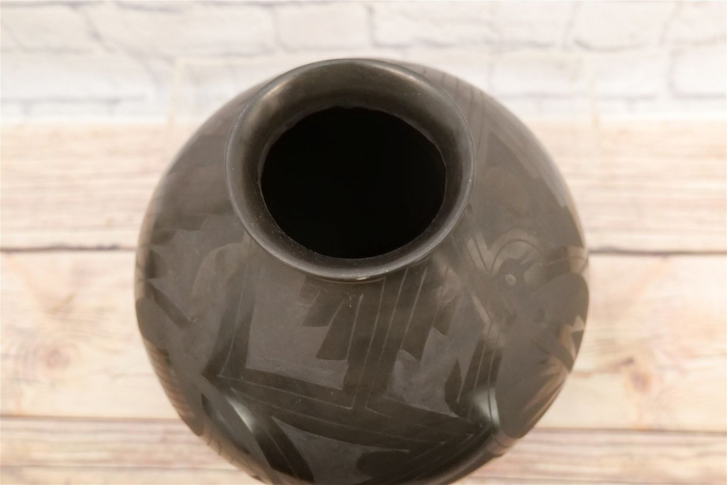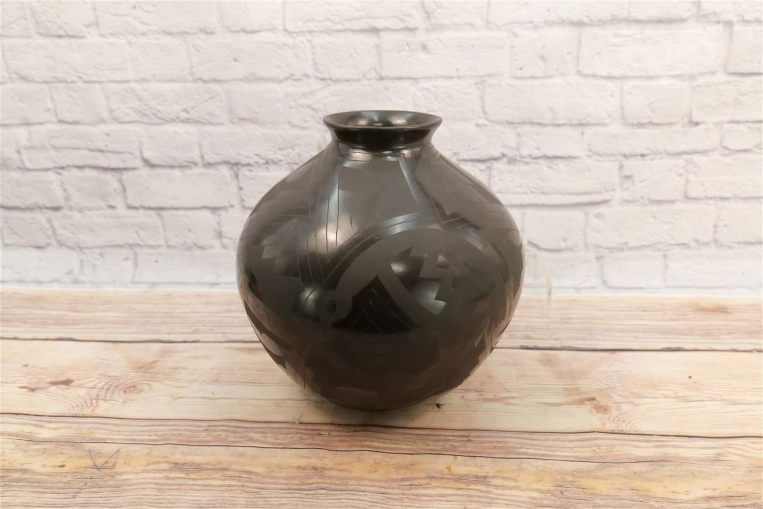 Black on Black Pottery Vase – Mexican/Native American Pottery – Mata Ortiz. Artist Signed Nicholas Silveira. Measures 13.5" tall x 13" wide. All invoices must be paid within 24 hours of the sale. We offer multiple shipping options, please read the terms as they have changed. We also offer Pick-Ups Friday, Saturday, and Monday immediately following the sale. BY APPOINTMENT ONLY. PLEASE READ THE NEW TERMS!!!