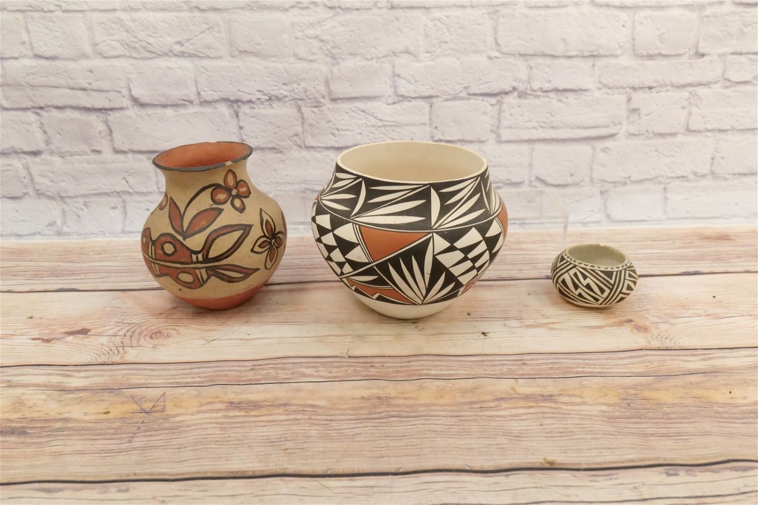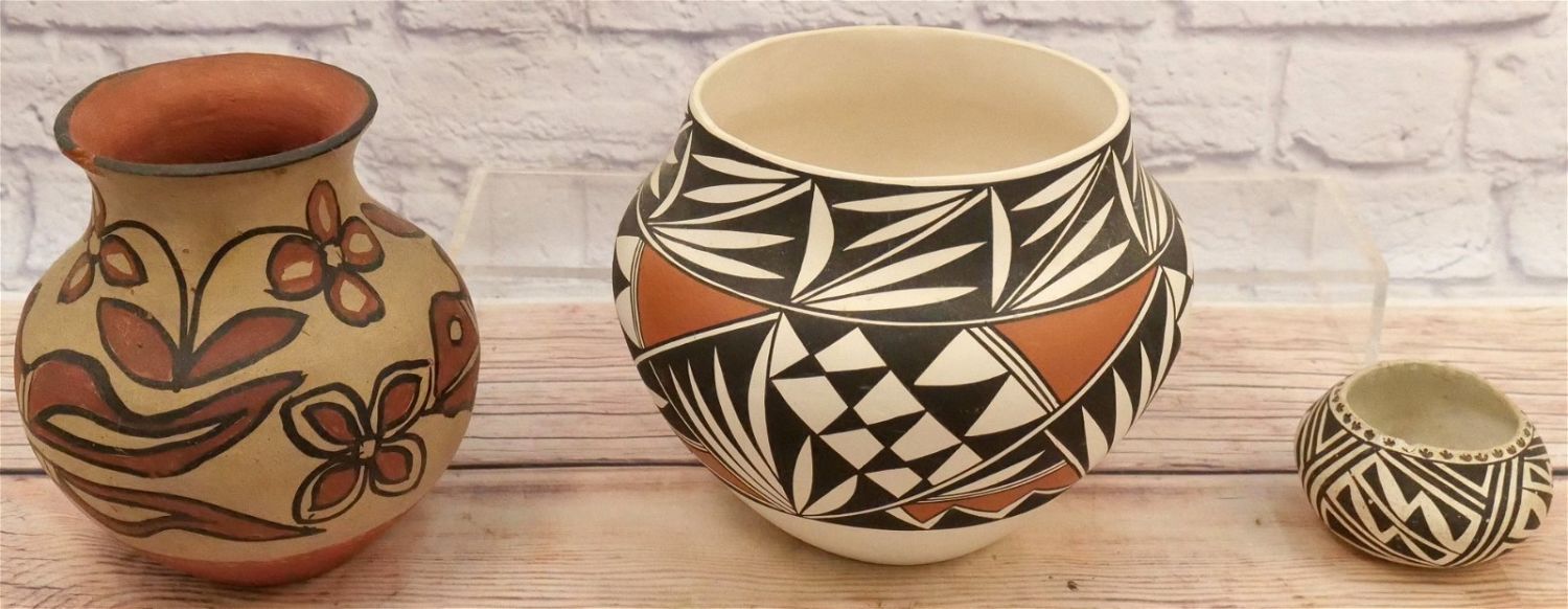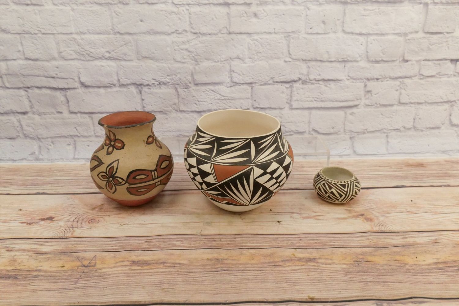 Lot of 3 Southwestern Pottery Vases. One signed Joe Acoma New Mexico, Helen Z. Patricio Acama New Mexico – Minor Chipping on Rim, and other Unsigned and has major chip on rim. Largest measures 8" tall. All invoices must be paid within 24 hours of the sale. We offer multiple shipping options, please read the terms as they have changed. We also offer Pick-Ups Friday, Saturday, and Monday immediately following the sale. BY APPOINTMENT ONLY. PLEASE READ THE NEW TERMS!!!