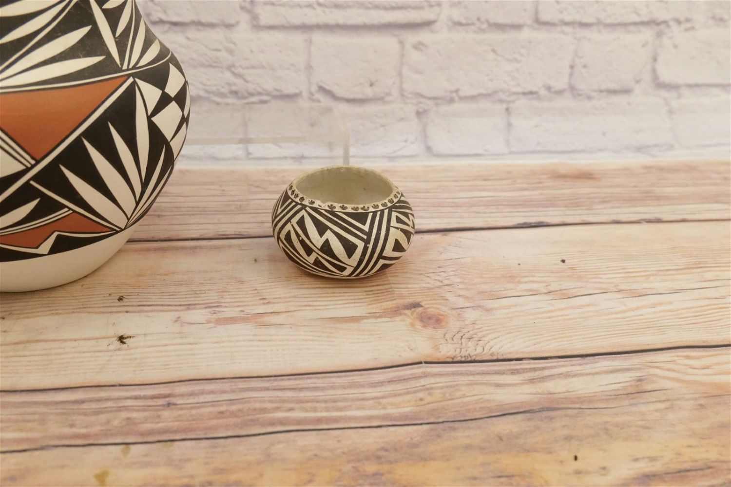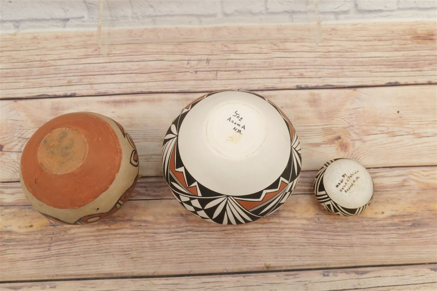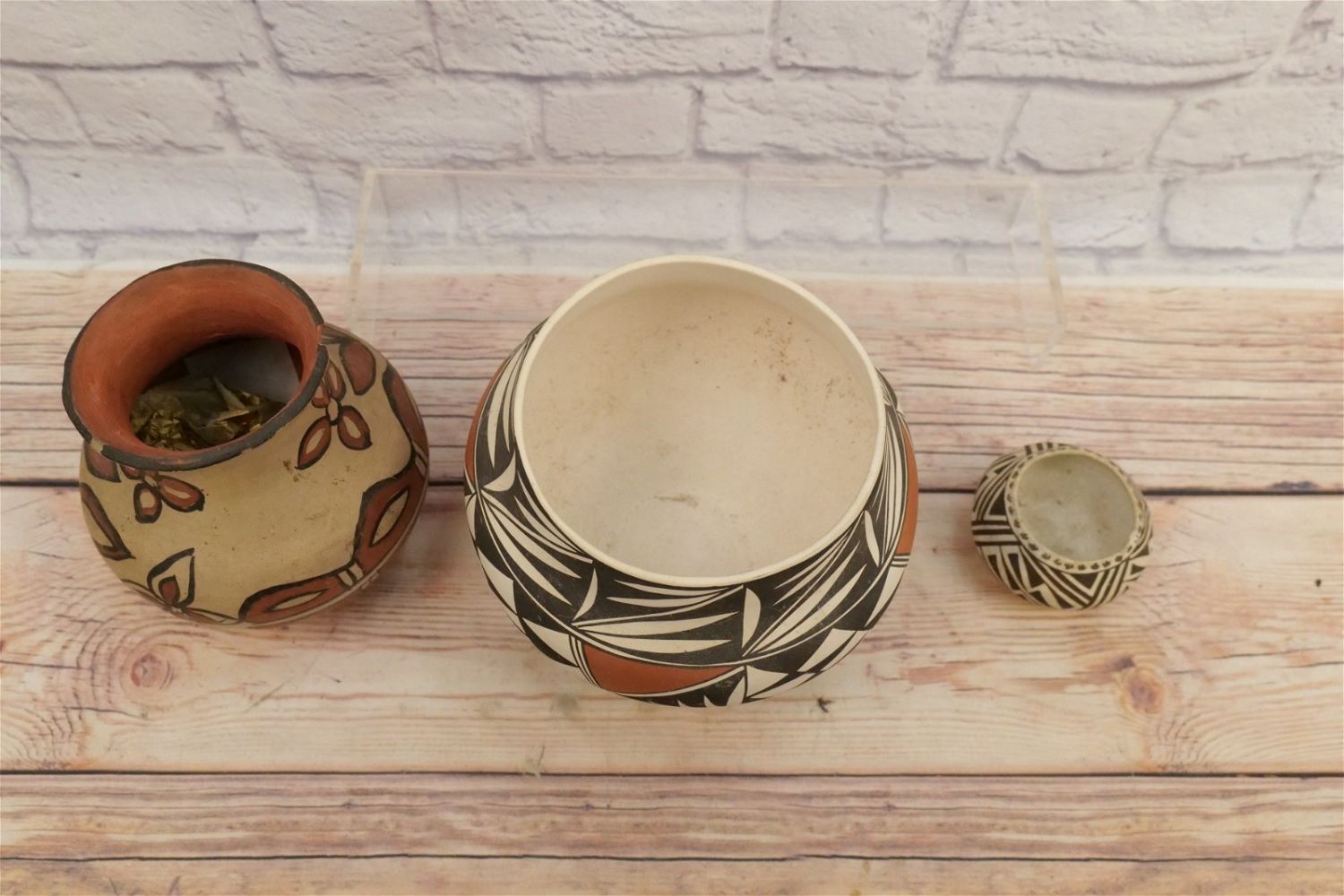 Lot of 3 Southwestern Pottery Vases. One signed Joe Acoma New Mexico, Helen Z. Patricio Acama New Mexico – Minor Chipping on Rim, and other Unsigned and has major chip on rim. Largest measures 8" tall. All invoices must be paid within 24 hours of the sale. We offer multiple shipping options, please read the terms as they have changed. We also offer Pick-Ups Friday, Saturday, and Monday immediately following the sale. BY APPOINTMENT ONLY. PLEASE READ THE NEW TERMS!!!