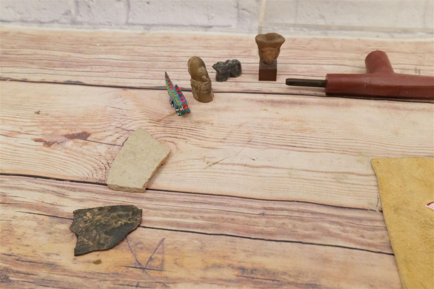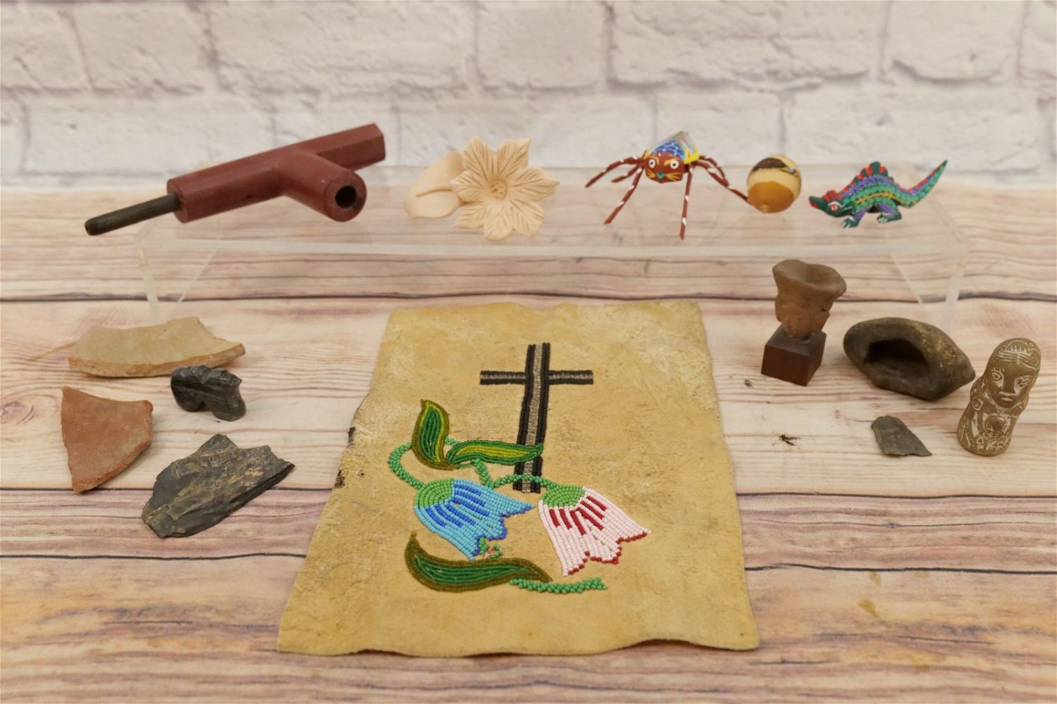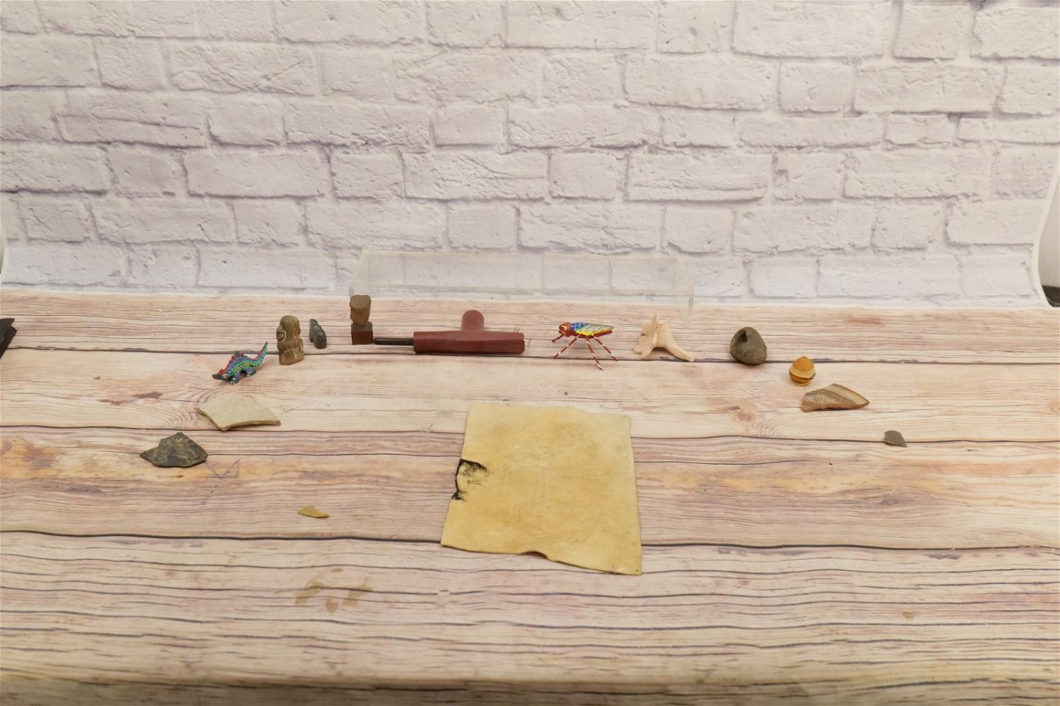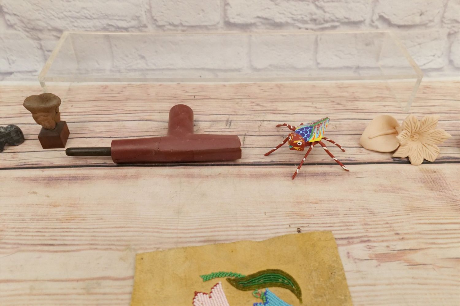 Group Lot of Native American Indian/Mexican Artifacts and Antiquities including Beaded Cross on Hyde with Flowers, Early Stone Tool – Missing Handle, Saint Claire Fern Fossil, Pottery Pieces, and Miniature Figures. Largest measures 10". All invoices must be paid within 24 hours of the sale. We offer multiple shipping options, please read the terms as they have changed. We also offer Pick-Ups Friday, Saturday, and Monday immediately following the sale. BY APPOINTMENT ONLY. PLEASE READ THE NEW TERMS!!!