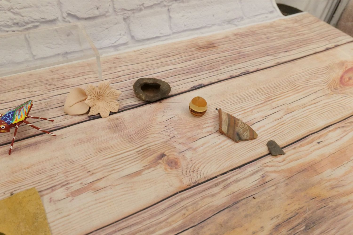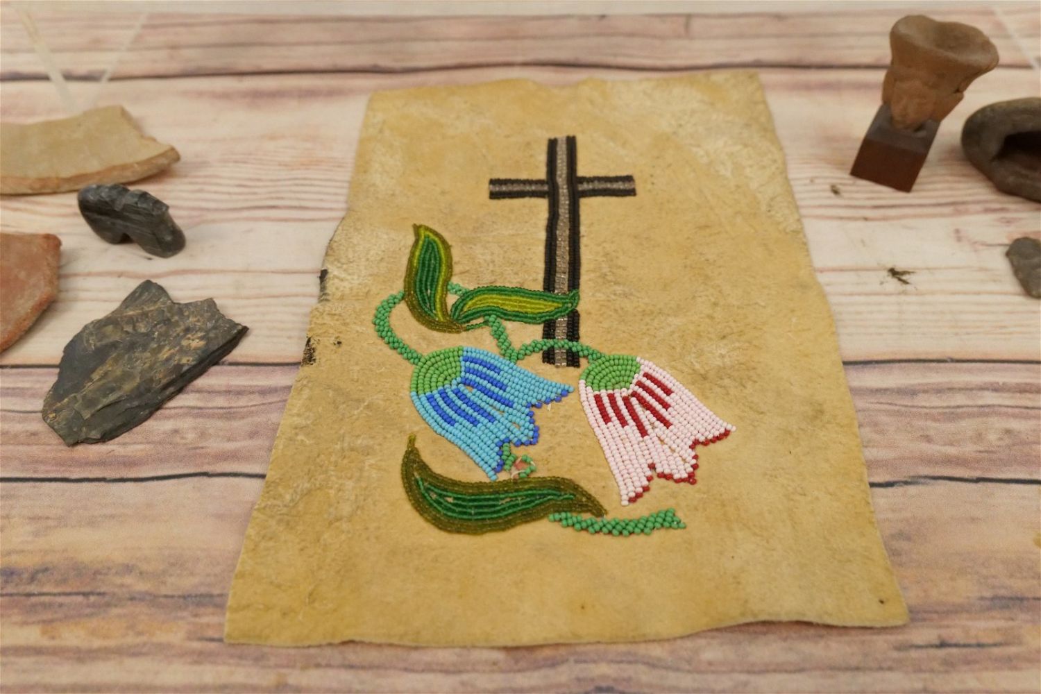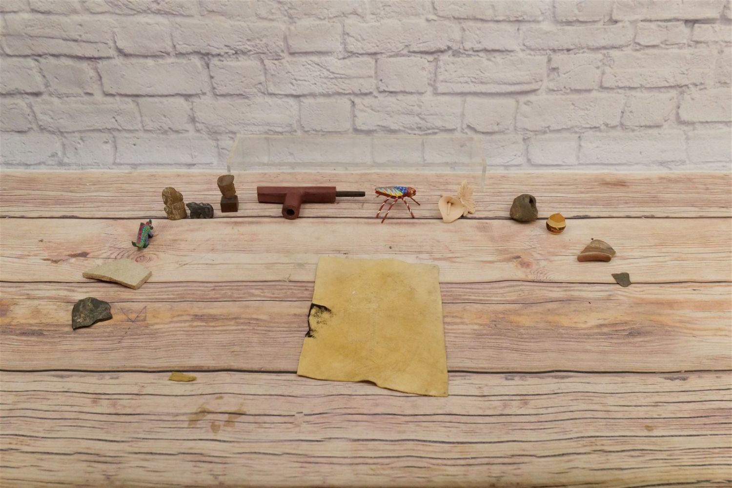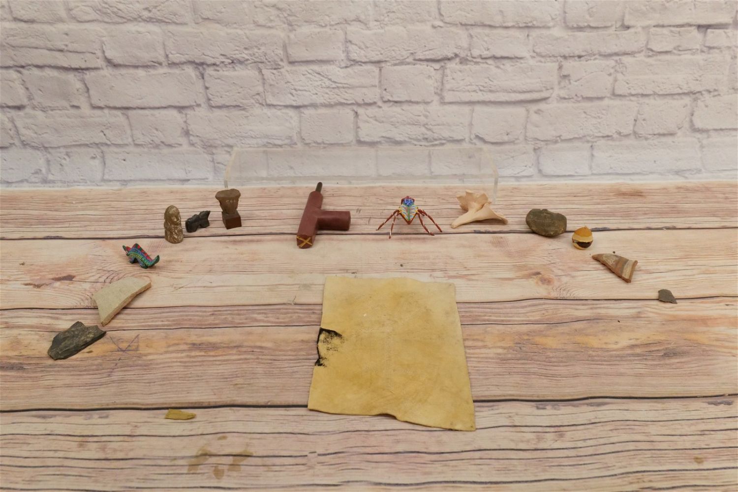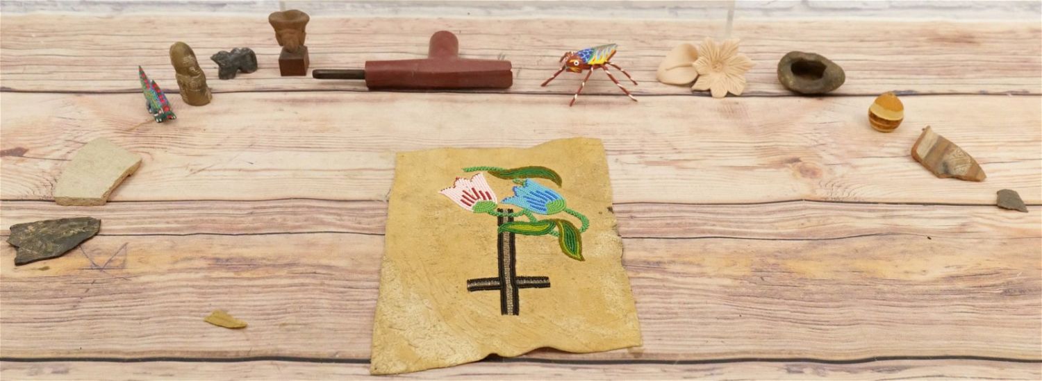 Group Lot of Native American Indian/Mexican Artifacts and Antiquities including Beaded Cross on Hyde with Flowers, Early Stone Tool – Missing Handle, Saint Claire Fern Fossil, Pottery Pieces, and Miniature Figures. Largest measures 10". All invoices must be paid within 24 hours of the sale. We offer multiple shipping options, please read the terms as they have changed. We also offer Pick-Ups Friday, Saturday, and Monday immediately following the sale. BY APPOINTMENT ONLY. PLEASE READ THE NEW TERMS!!!