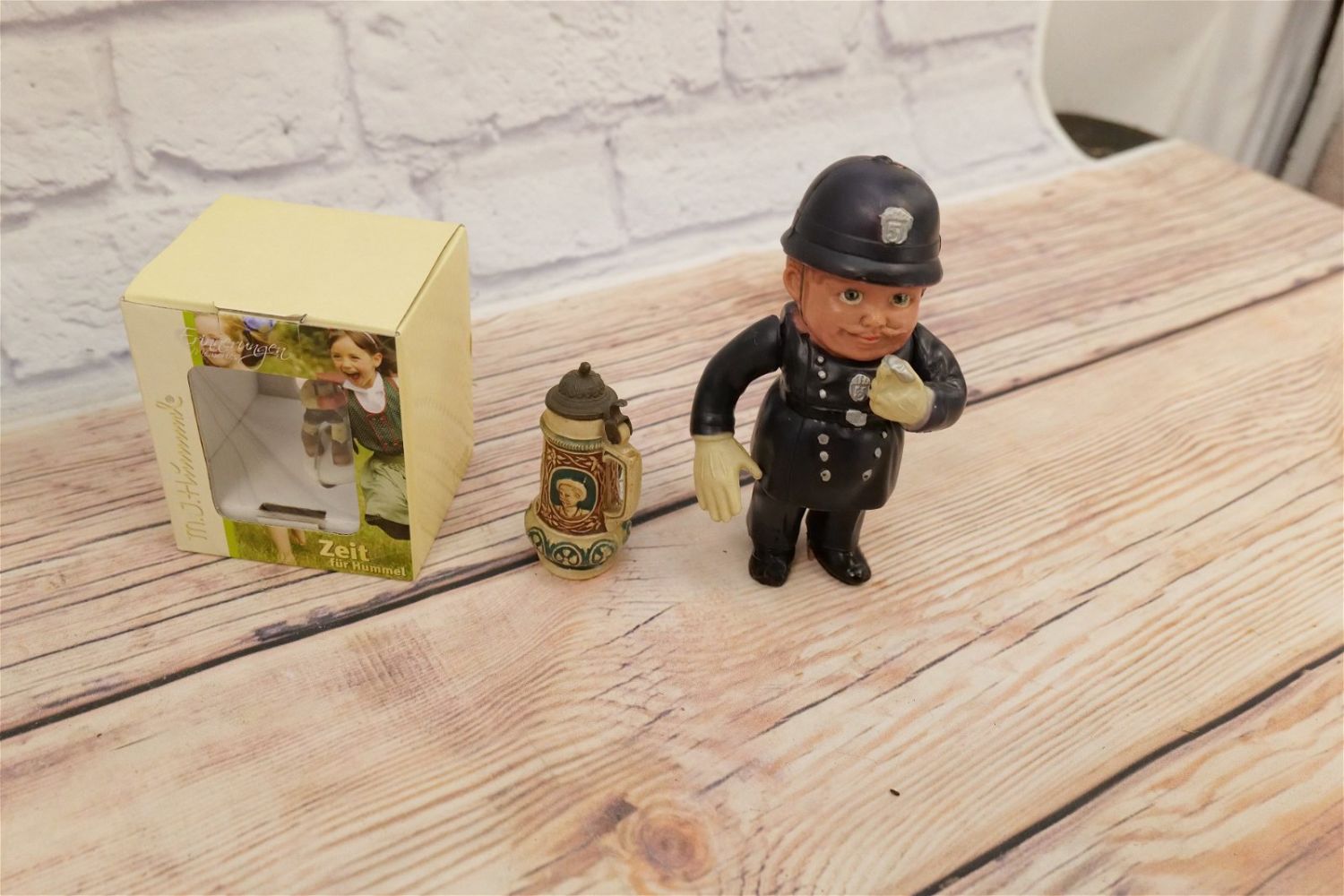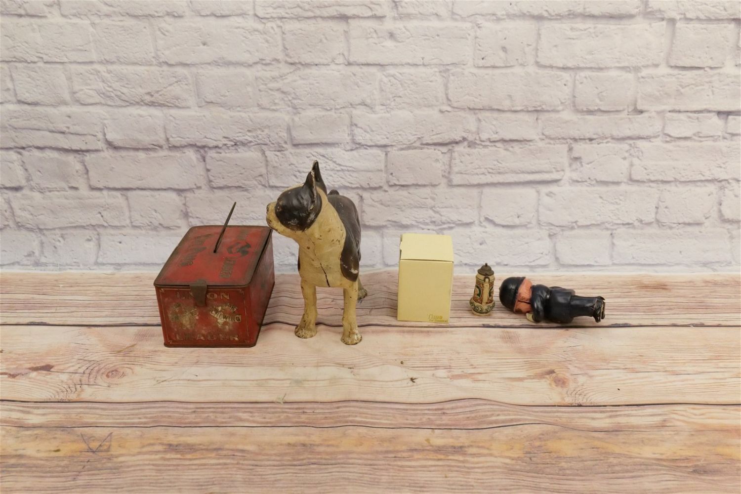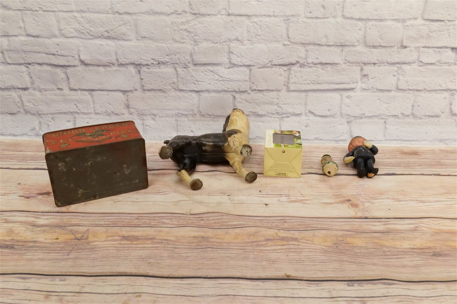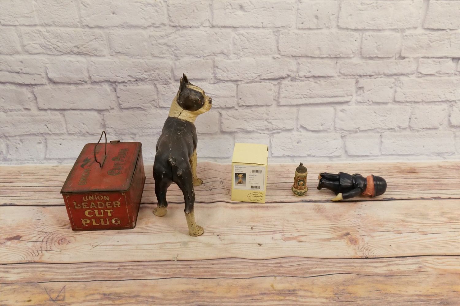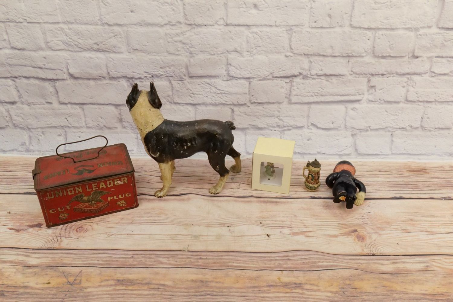Lot of Antiquities including Antique Cast Iron Dog Door Stopper – Has original paint, Celluloid Keystone Cop – Jointed Arm Doll, Union Leader Smoke and Chew Tobacco Advertising Tin, Miniature Stein, and Miniature Hummel – Winter’s Here in Box. Largest measures 11" tall. All invoices must be paid within 24 hours of the sale. We offer multiple shipping options, please read the terms as they have changed. We also offer Pick-Ups Friday, Saturday, and Monday immediately following the sale. BY APPOINTMENT ONLY. PLEASE READ THE NEW TERMS!!!