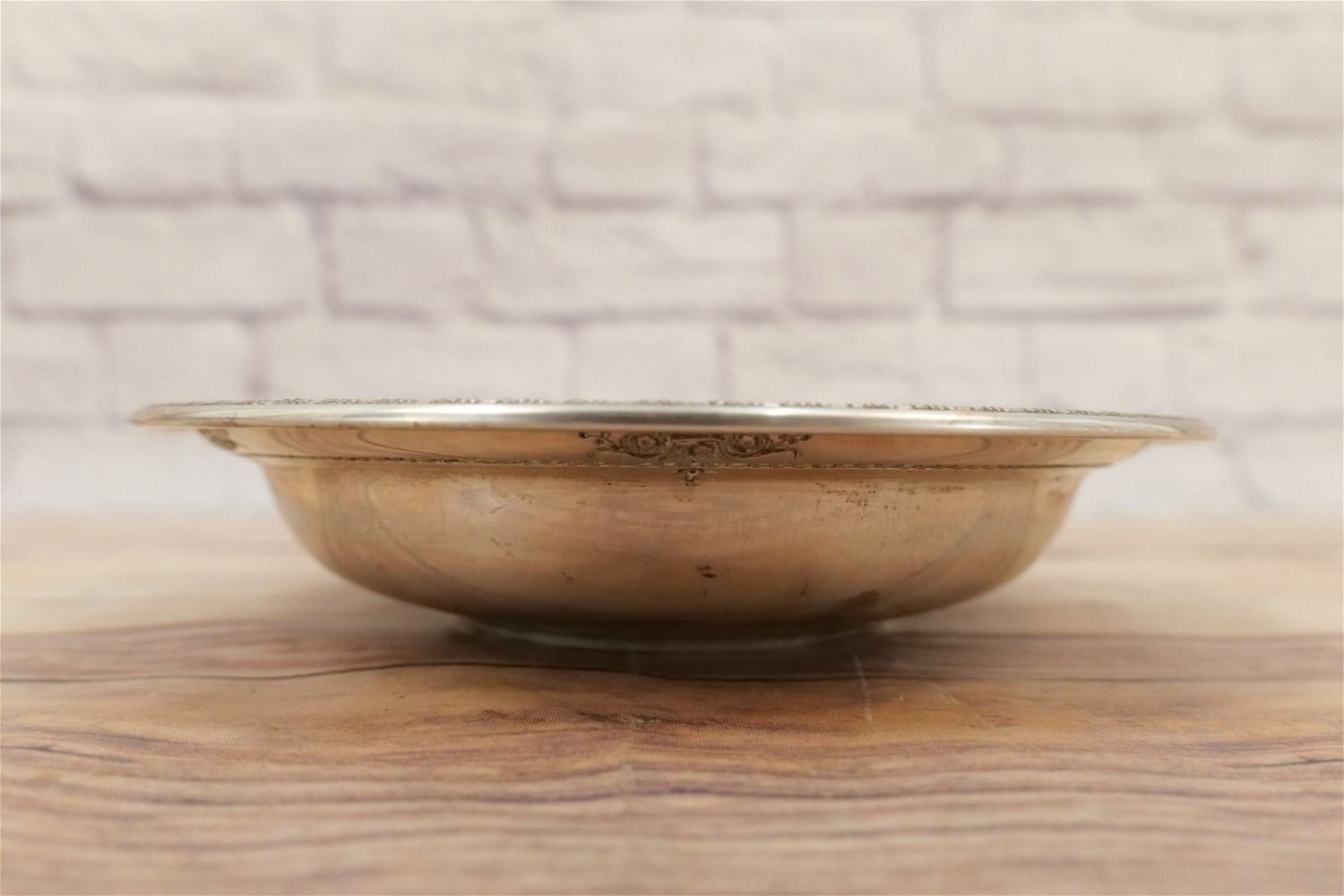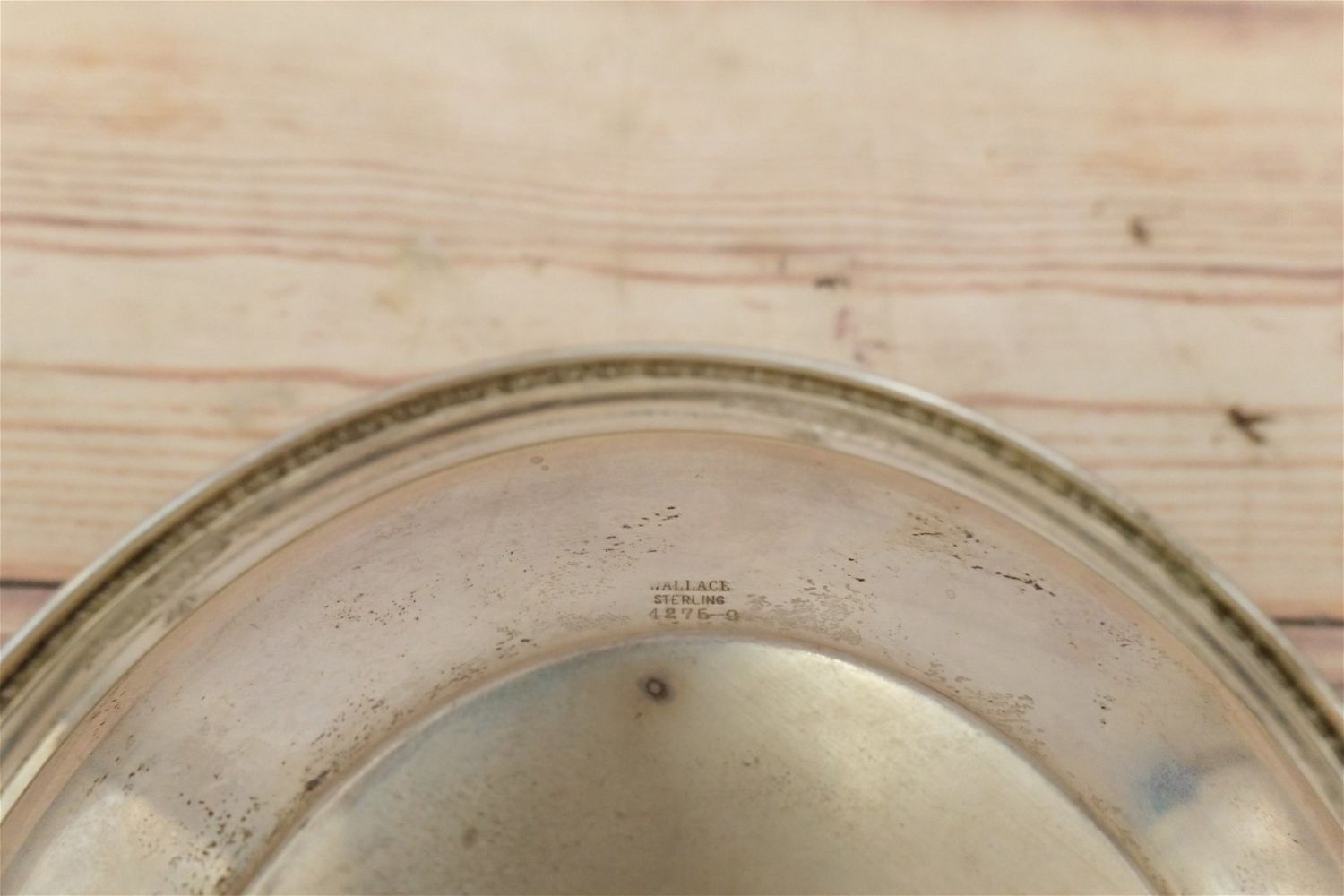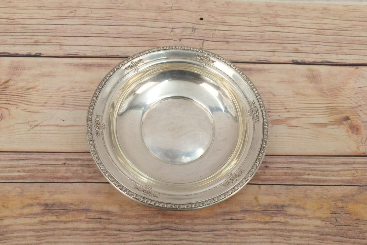 Wallace Sterling Silver Bowl with Decorative Rim and Flower Design. Marked Wallace 4275-9. Weighs approx. 10.1 oz. Measures 10" diameter. All invoices must be paid within 24 hours of the sale. We offer multiple shipping options, please read the terms as they have changed. We also offer Pick-Ups Friday, Saturday, and Monday immediately following the sale. BY APPOINTMENT ONLY. PLEASE READ THE NEW TERMS!!!