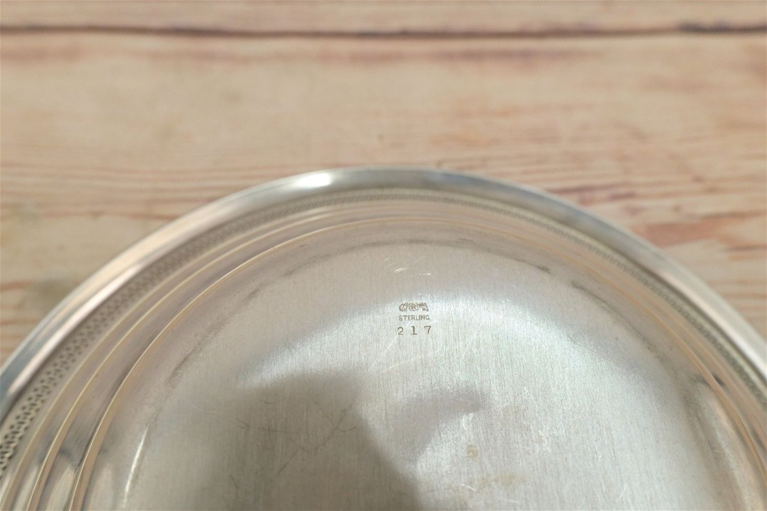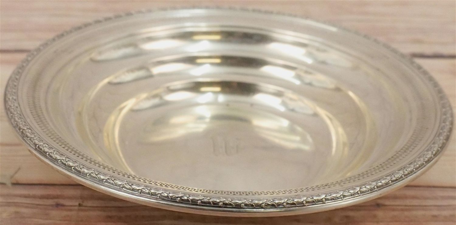 Reed & Barton Sterling Silver Bowl. Has open pierce work border and Bella flower rim. Monogramed – Appears to be M. Marked Sterling 217 Hallmarked Reed & Barton. Weighs approx. 10.7 oz. Measures 9.5" diameter. All invoices must be paid within 24 hours of the sale. We offer multiple shipping options, please read the terms as they have changed. We also offer Pick-Ups Friday, Saturday, and Monday immediately following the sale. BY APPOINTMENT ONLY. PLEASE READ THE NEW TERMS!!!