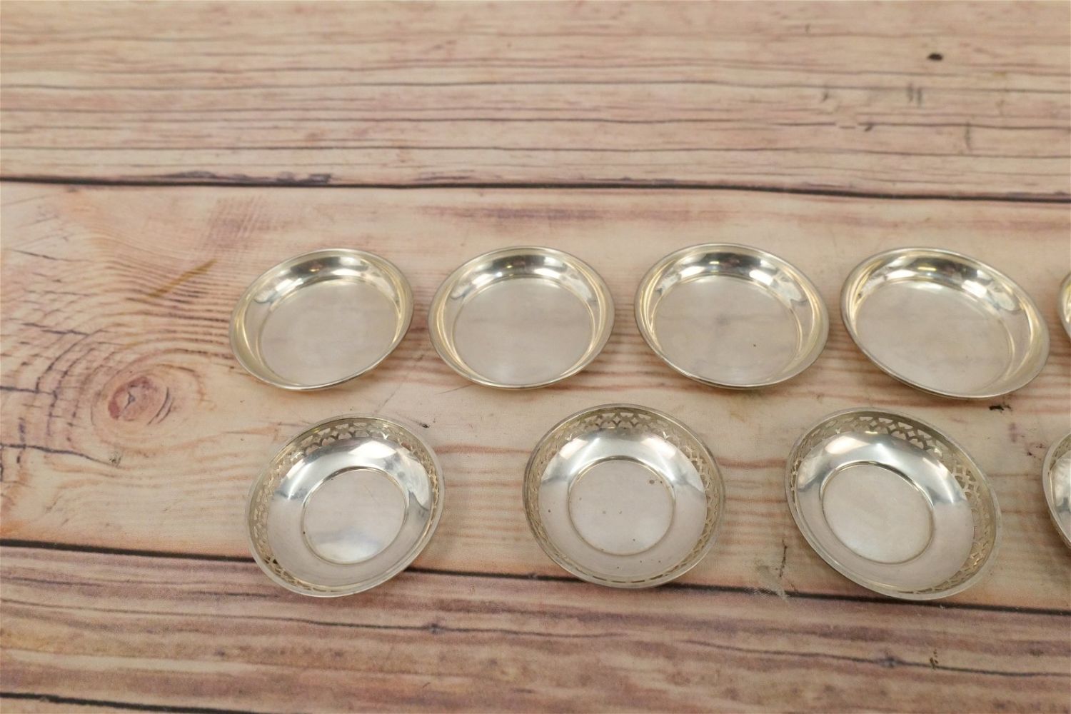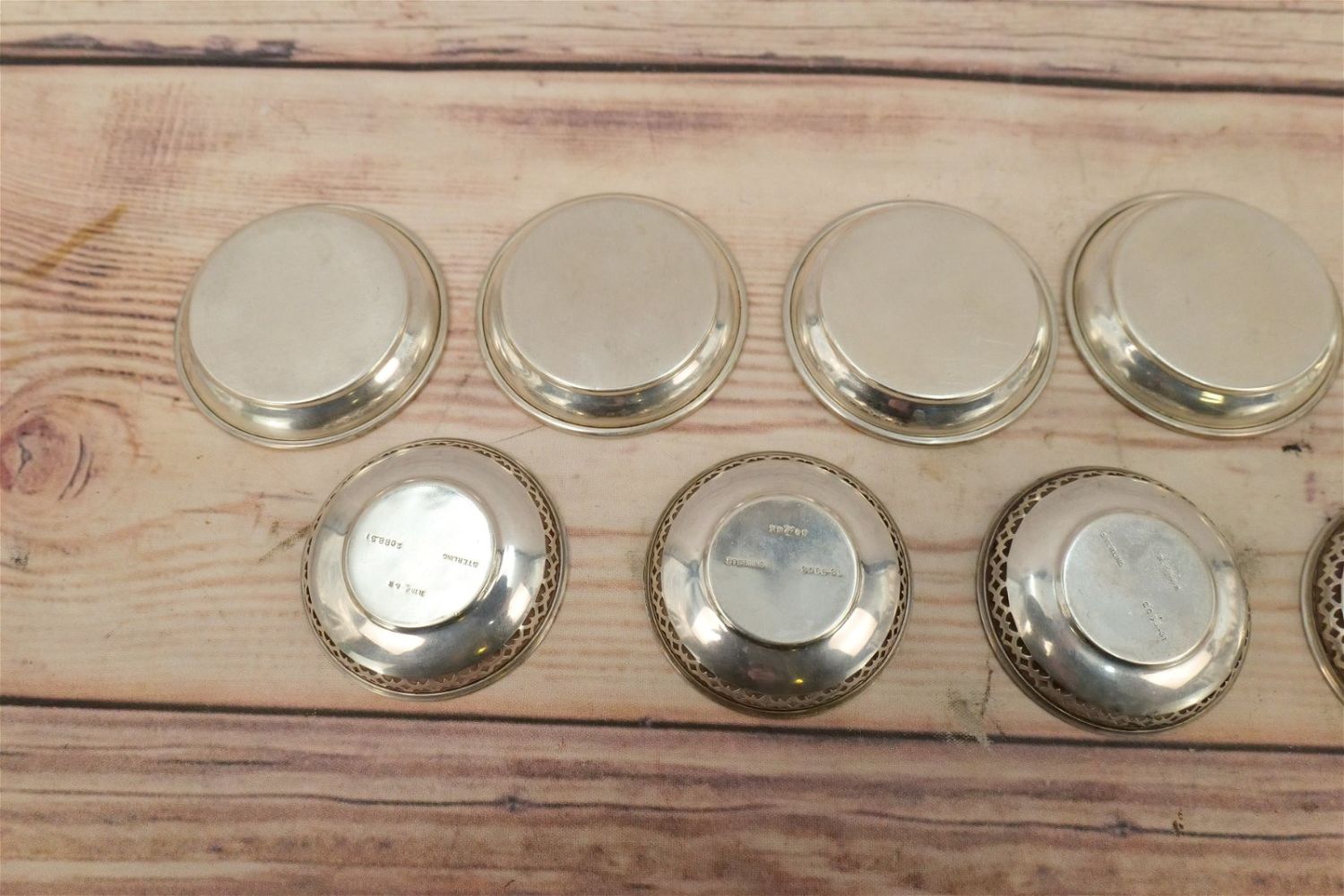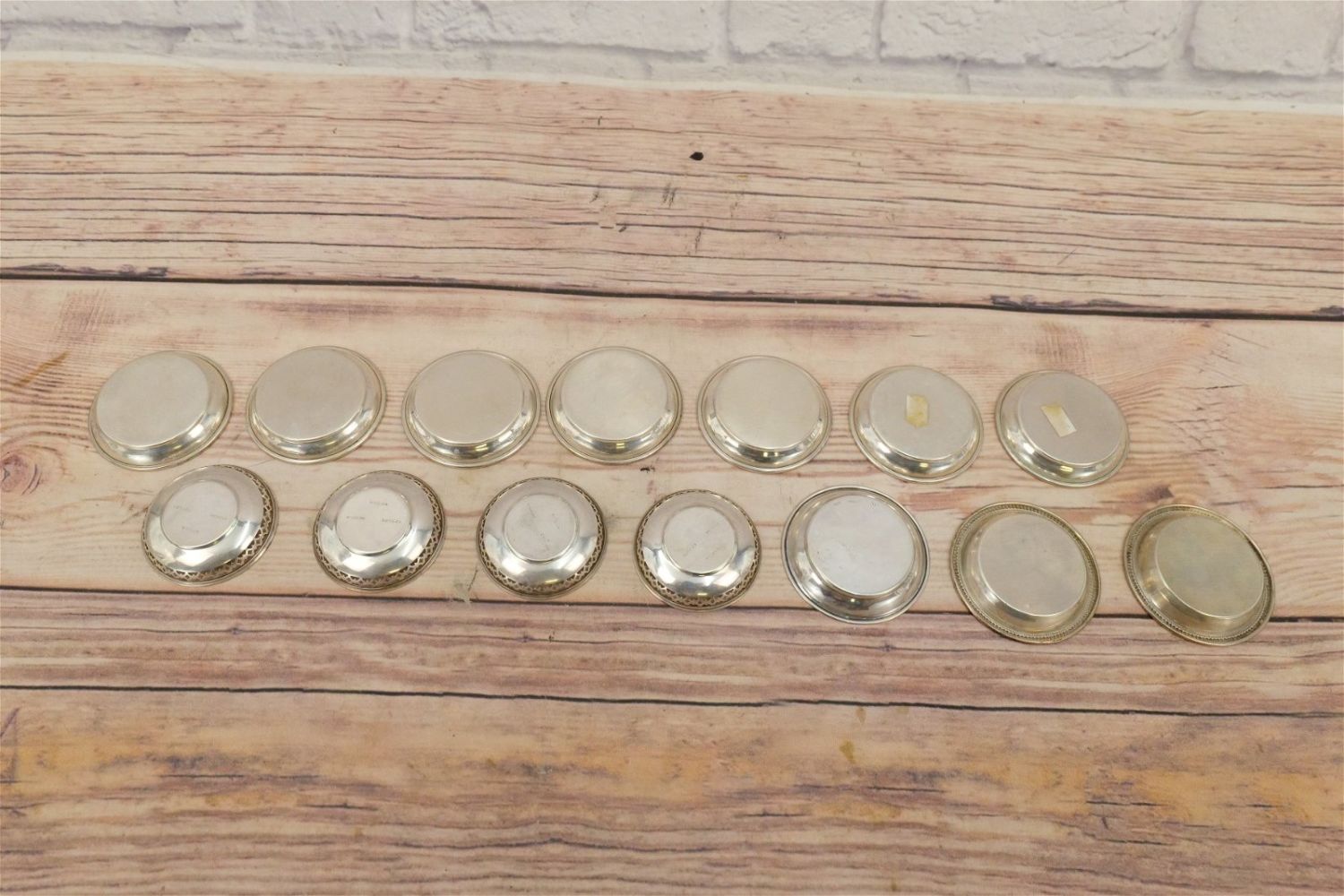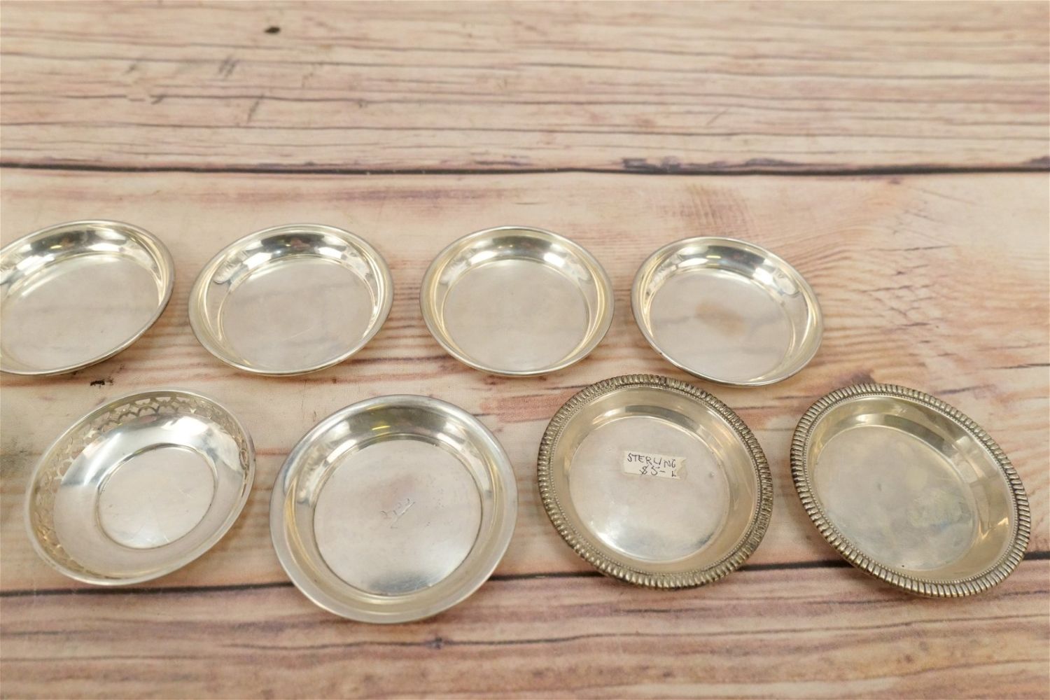 Lot of 14 Sterling Silver Table Salts/Personal Waste. Including 7 Matching Marked Sterling, 4 Matching Reed & Barton #20883, 2 Matching Marked Sterling and 1 Hallmarked with Gate in Form of H – Monogramed with Letter A. Weighs approx. 8.5". Largest measures 3.5" diameter. All invoices must be paid within 24 hours of the sale. We offer multiple shipping options, please read the terms as they have changed. We also offer Pick-Ups Friday, Saturday, and Monday immediately following the sale. BY APPOINTMENT ONLY. PLEASE READ THE NEW TERMS!!!