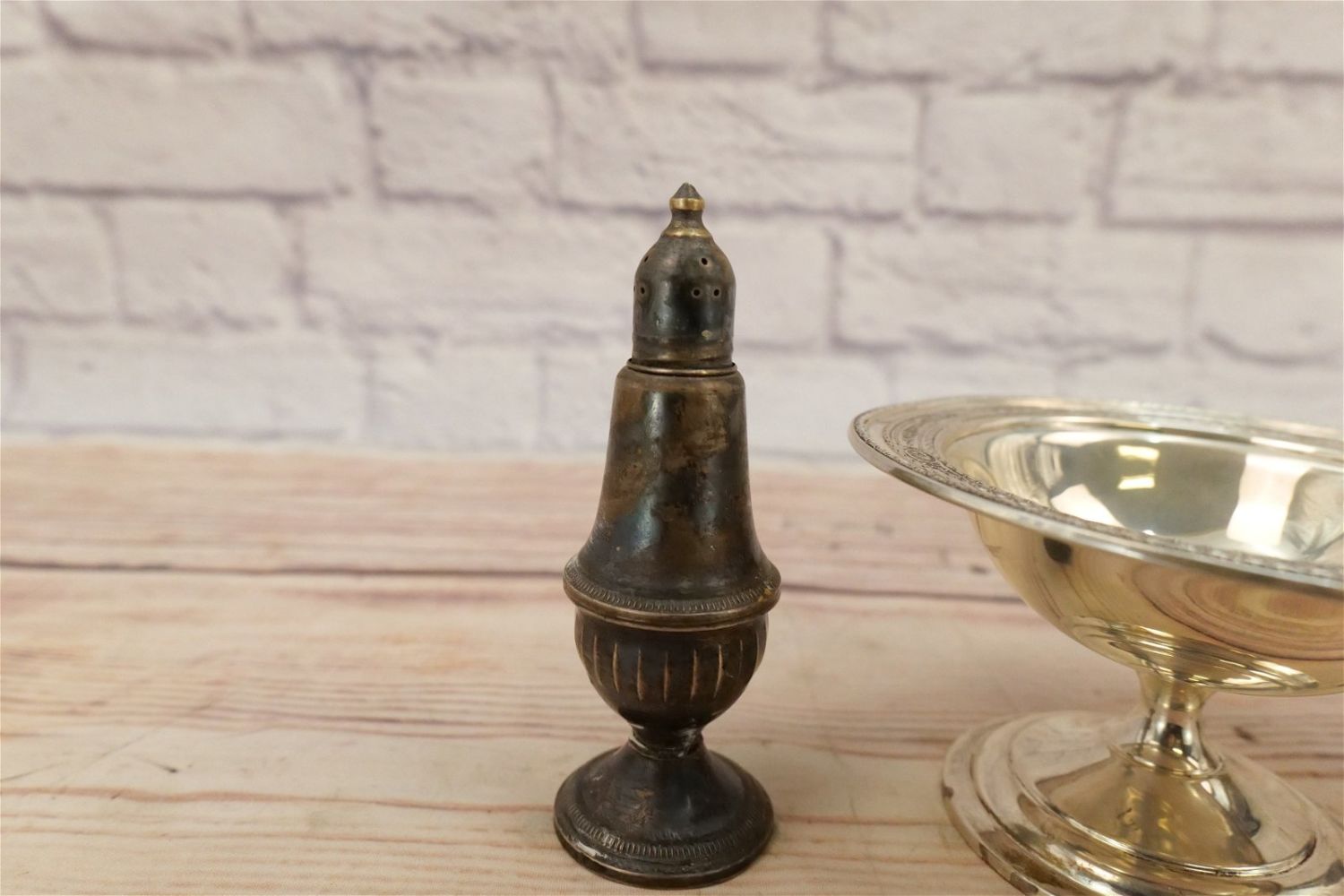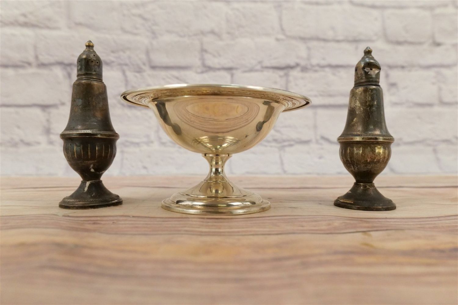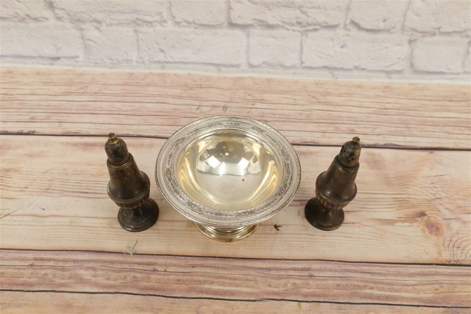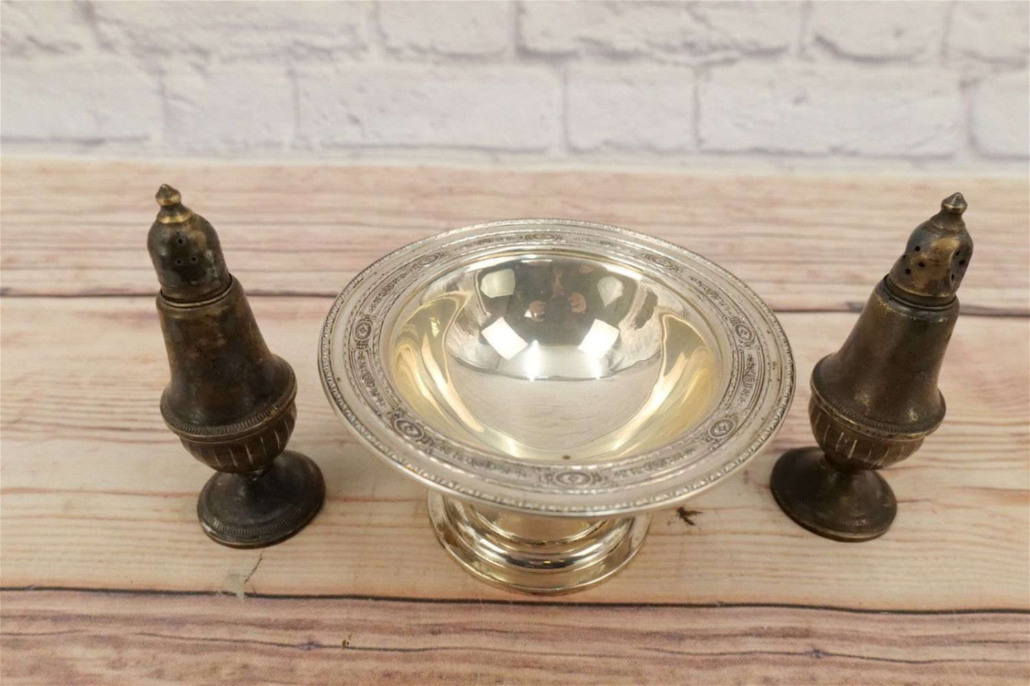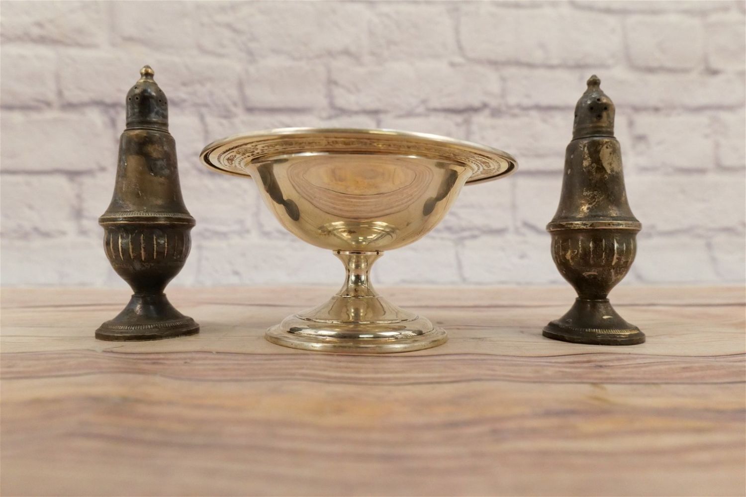 Lot of Sterling Silver Tableware Pieces including Sterling #645 Compote, and Pair of Weighted Salt and Pepper Shakers. Compote measures 6" diameter. All invoices must be paid within 24 hours of the sale. We offer multiple shipping options, please read the terms as they have changed. We also offer Pick-Ups Friday, Saturday, and Monday immediately following the sale. BY APPOINTMENT ONLY. PLEASE READ THE NEW TERMS!!!