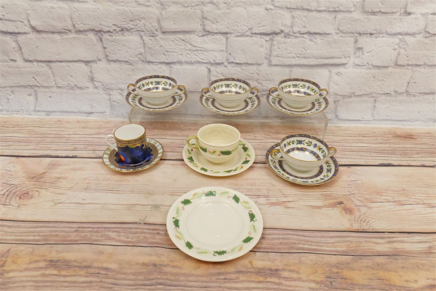 Lot of Porcelain Dishes including Set of 4 Limoges Double Handled Soups with Underplates, Belleek Holly Pattern Cup and 2 Saucers, and Royal Worchester To Celebrate the Millennium Planetarium Cup and Saucer. All invoices must be paid within 24 hours of the sale. We offer multiple shipping options, please read the terms as they have changed. We also offer Pick-Ups Friday, Saturday, and Monday immediately following the sale. BY APPOINTMENT ONLY. PLEASE READ THE NEW TERMS!!!