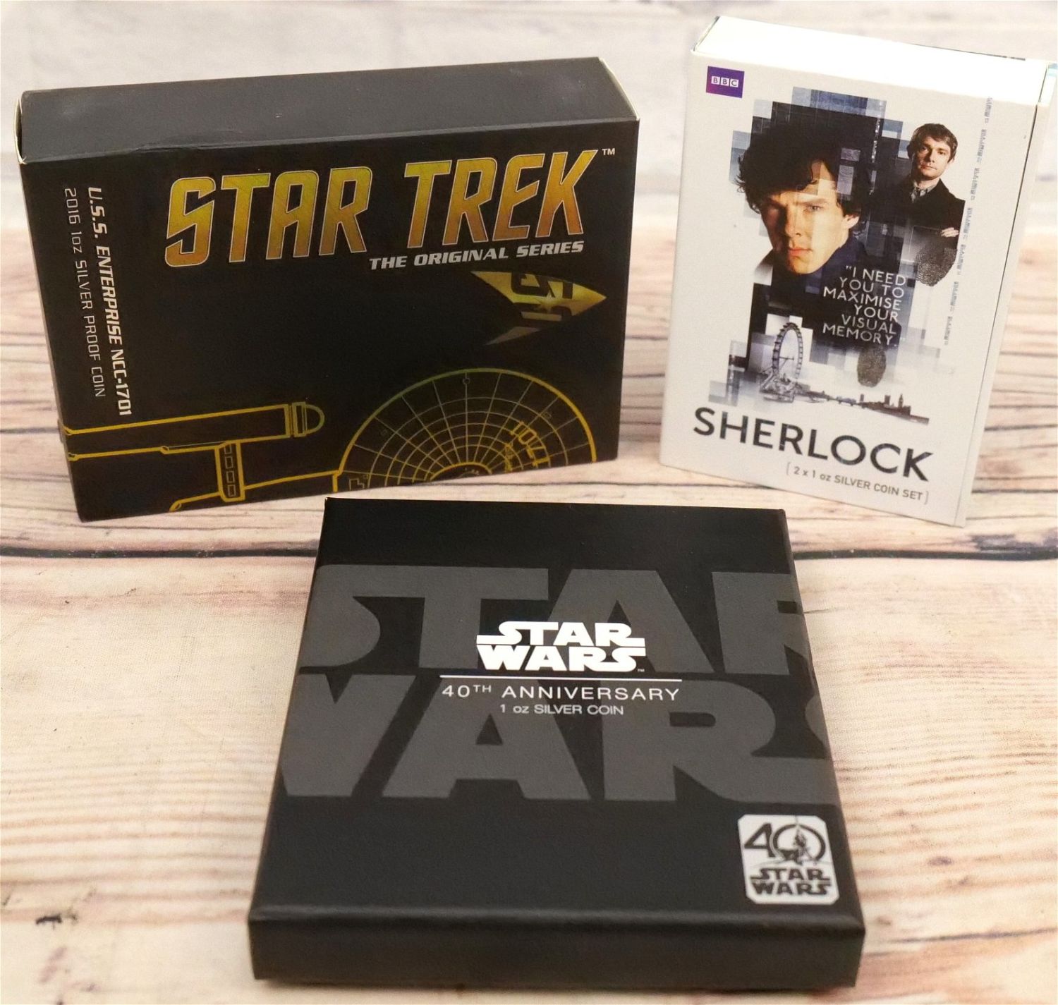 Lot of 3 Silver Coins including Star Wars 40th Anniversary 1 oz. Silver Coin, Star Trek USS Enterprise NCC-1701 2016 1oz Silver Proof Coin, and Sherlock 2 x 1oz. Silver Coin Set. All come in original packaging. All invoices must be paid within 24 hours of the sale. All items are shipped USPS or UPS and will be billed separately. A $12 handling fee is added to the shipping price per lot if shipped in house. Some items or large quantity of purchases will be packed and shipped via the Monmouth Junction UPS store. Local pickups are at our Monmouth Junction location on Thursday, Friday, Saturday and Monday ONLY! All pickups are by appointment only. Any condition issues will be listed in the description. Please read the terms for full information.