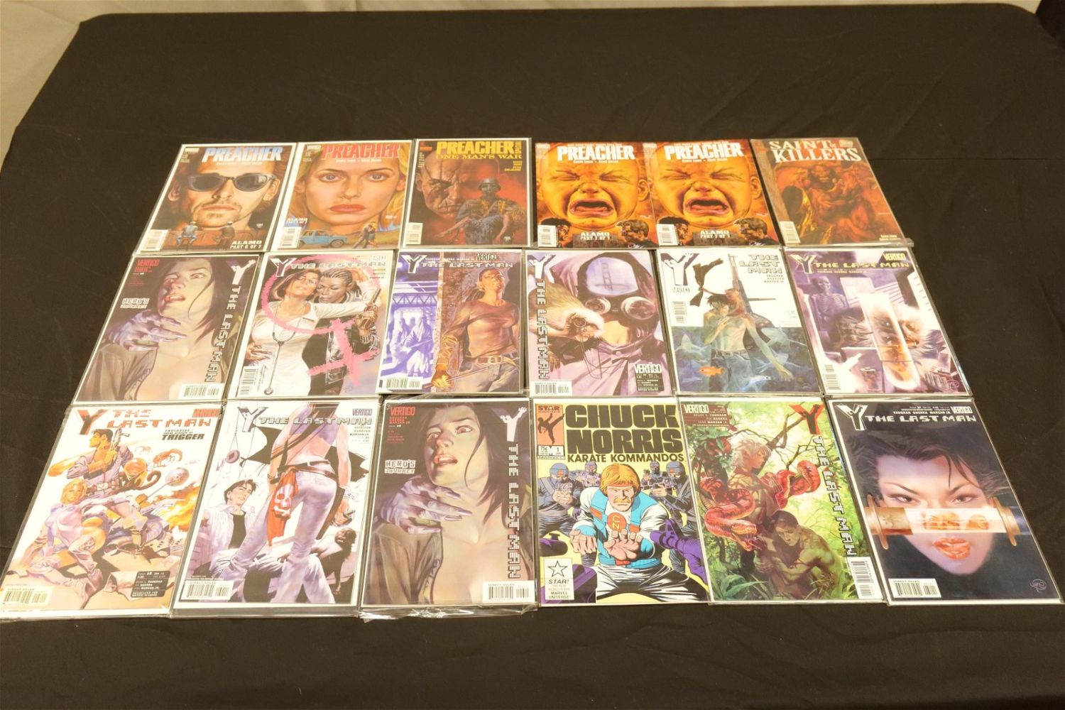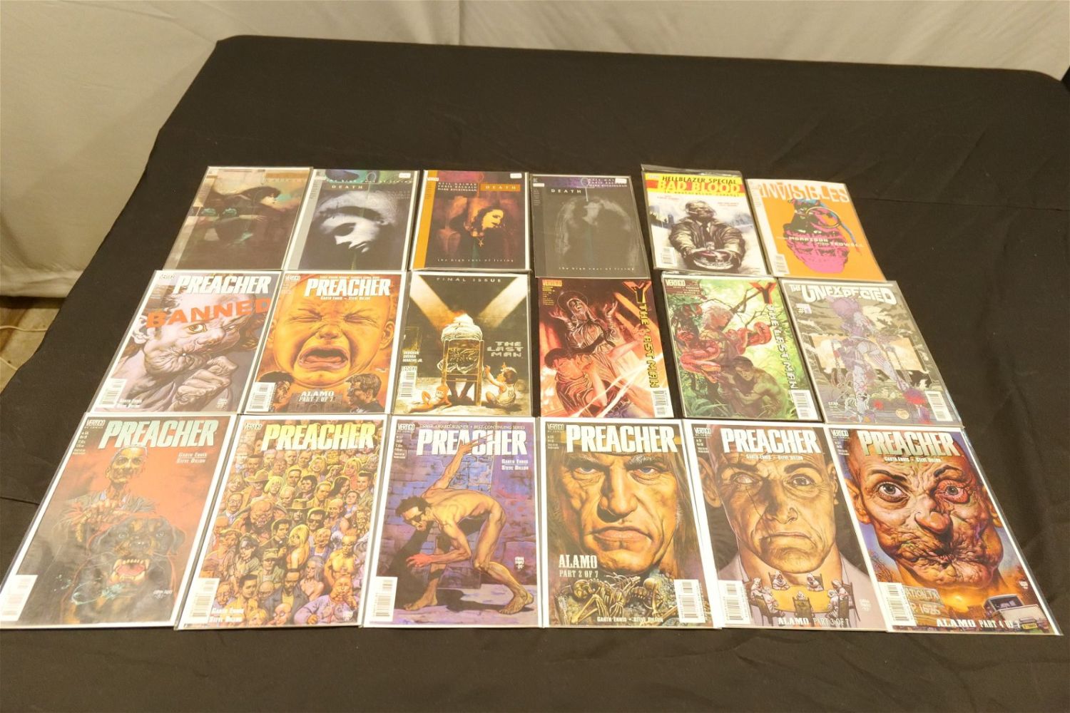 Short Box of DC Vertigo Comics including Y The Last Man, Hellblazer, Preacher, American Vampire, The Books of Magic, Sandman, Daytripper, Preacher, and More. Short Box is Full. All invoices must be paid within 24 hours of the sale. We offer multiple shipping options, please read the terms as they have changed. We also offer Pick-Ups Thursday, Friday, Saturday, and Monday immediately following the sale. BY APPOINTMENT ONLY. PLEASE READ THE NEW TERMS!!!