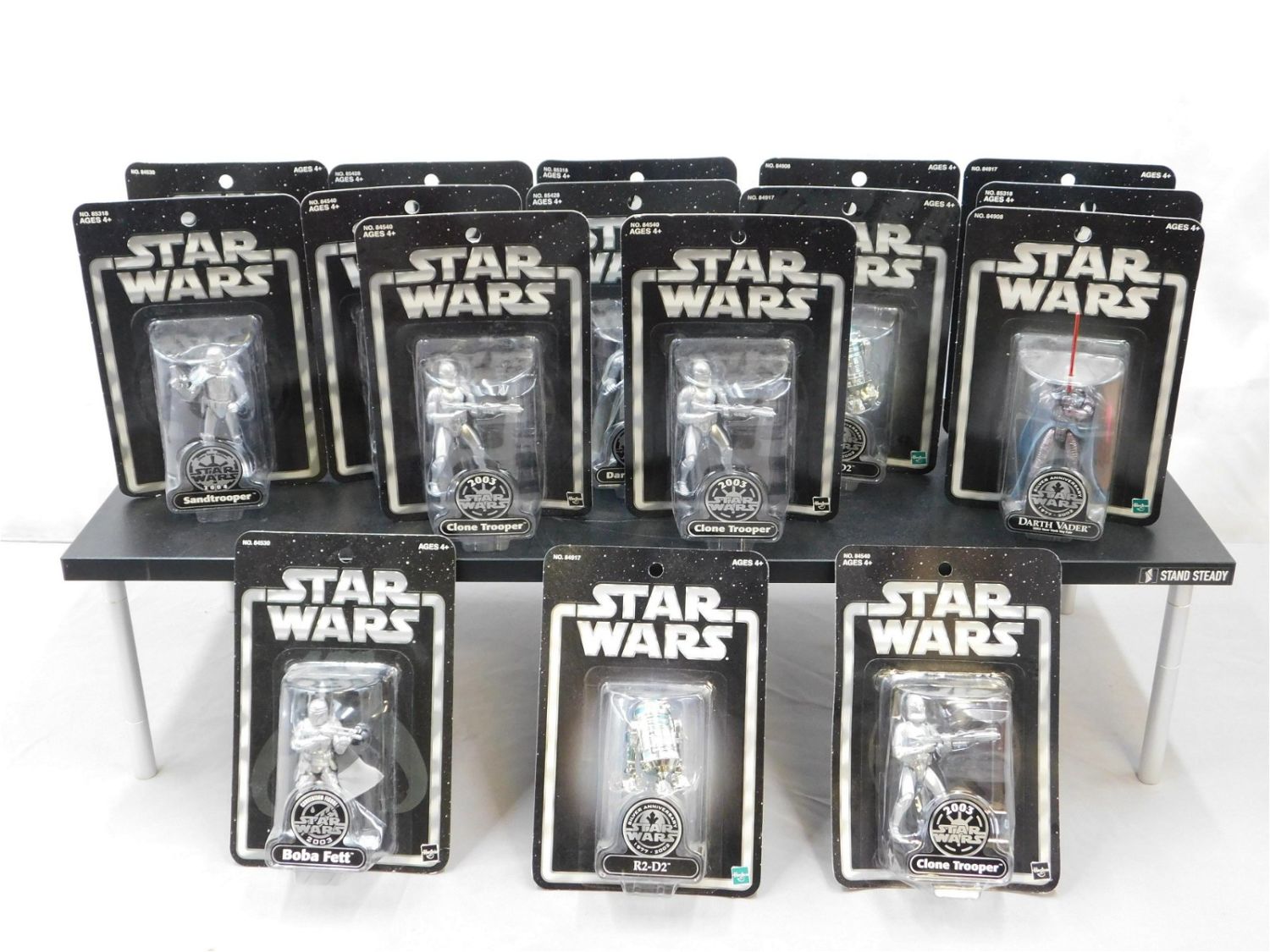 Lot of 16 Star Wars Silver Anniversary and Silver Saga 3.75" Figures. All new on card. All invoices must be paid within 24 hours of the sale. We offer multiple shipping options, please read the shipping terms as they have changed. We also offer Pick-Ups Thursday, Friday, Saturday, and Monday immediately following the sale BY APPOINTMENT ONLY. PLEASE READ THE NEW SHIPPING TERMS!!