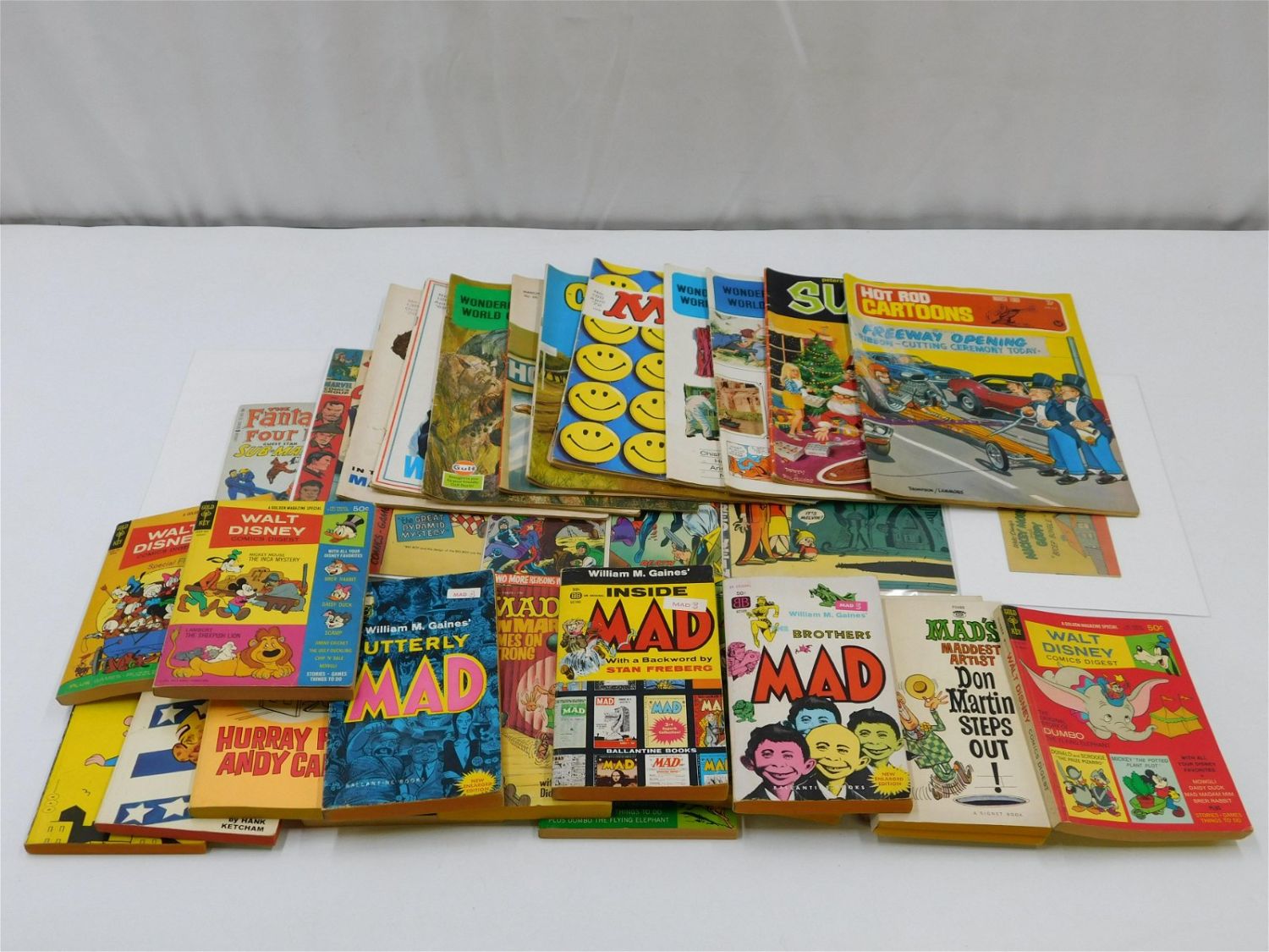Lot of Comics, Books and Magazines. Including 4 Silver Age Comics, Disney Giveaway Comics, Mad Magazines, Hot Rod Cartoons, Surf Toon Magazine, Cycle World Magazine, Wonderful World of Disney, and 17 Paperbacks/Digests. Includes Reprint of Mad Magazine #1. All invoices must be paid within 24 hours of the sale. All items are shipped USPS or UPS and will be billed separately. A $12 handling fee is added to the shipping price per lot if shipped in house. Some items or large quantity of purchases will be packed and shipped via the Monmouth Junction UPS store. Local pickups are at our Monmouth Junction location on Thursday, Friday, Saturday and Monday ONLY! All pickups are by appointment only. Any condition issues will be listed in the description. Please read the terms for full information.