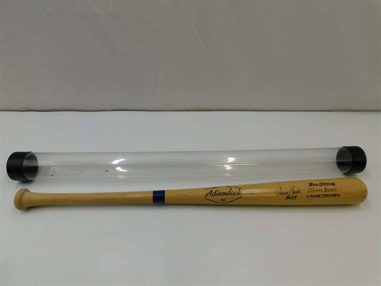 Johnny Bench HOF ’89 Autographed Baseball Bat. Comes on Adirondack Johnny Bench Flame Treated Big Stick. Comes with plastic tube case. All items in this sale came from a single owner collection with a 30 day guarantee that the autographs are authentic. All invoices must be paid within 24 hours of the sale. There are 3 Shipping Options. Please read the Terms of Sale and Shipping Options in the Terms. If you don’t read the terms, you will be upset because you don’t know what is happening. Local pickups are at our Monmouth Junction location on Friday, Saturday and Monday ONLY! All pickups are by appointment only. Any condition issues will be listed in the description. Please read the terms for full information.
