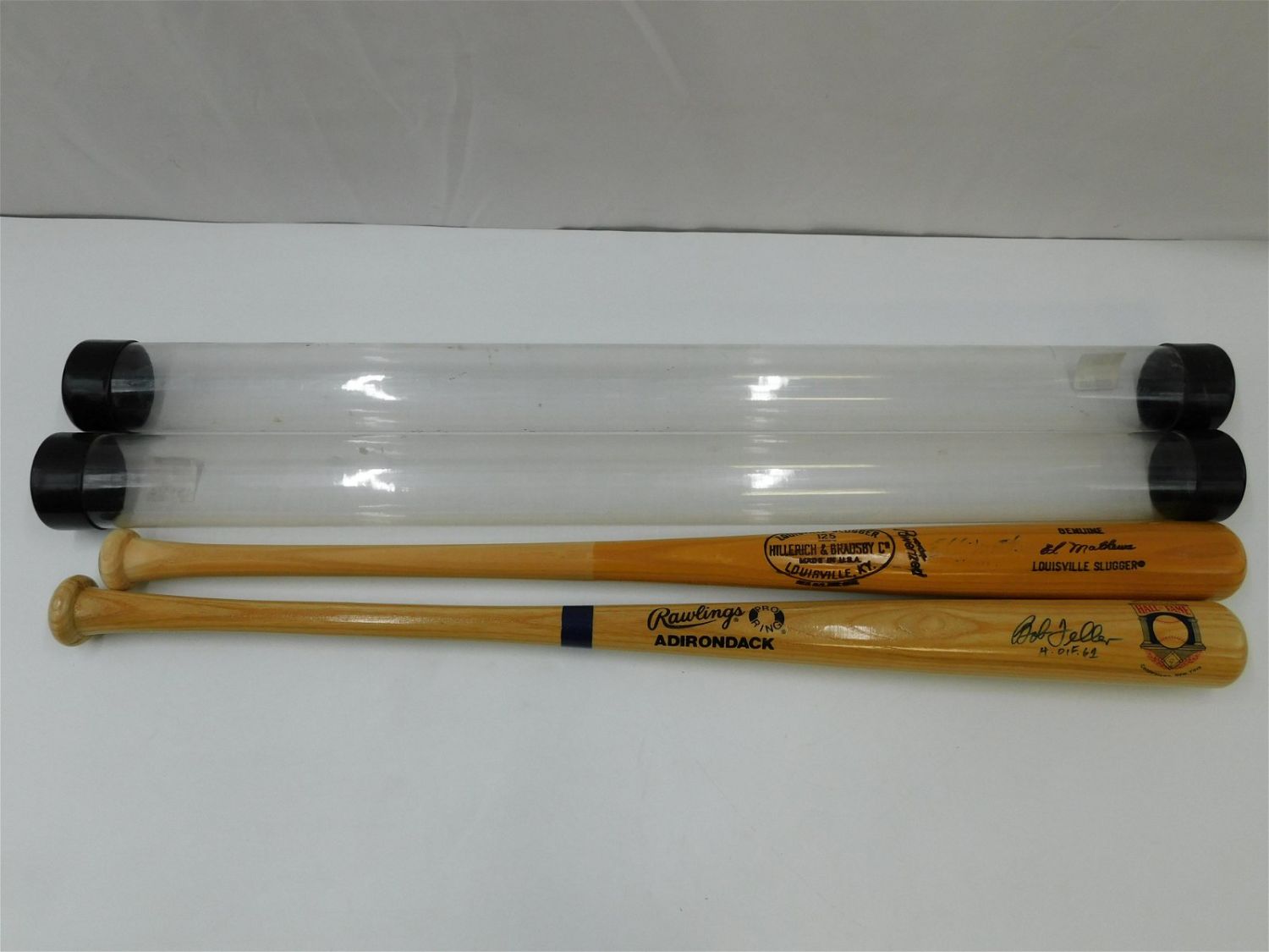 Lot of 2 Autographed Baseball Bats including Eddie Mathews – Faded Signature on Genuine Ed Mathews Louisville Slugger and Bob Feller HOF ’61 on Rawlings Adirondak HOF Bat. All items in this sale came from a single owner collection with a 30 day guarantee that the autographs are authentic. All invoices must be paid within 24 hours of the sale. There are 3 Shipping Options. Please read the Terms of Sale and Shipping Options in the Terms. If you don’t read the terms, you will be upset because you don’t know what is happening. Local pickups are at our Monmouth Junction location on Friday, Saturday and Monday ONLY! All pickups are by appointment only. Any condition issues will be listed in the description. Please read the terms for full information.