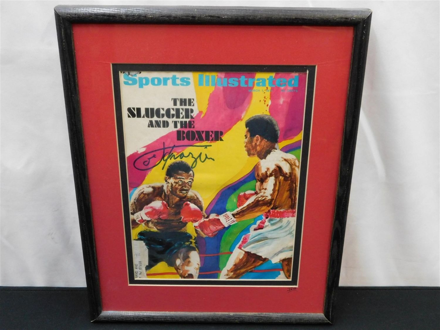 Framed Sports Illustrated Magazine March 1 1971 – Autographed by Joe Frazier. Back matting showing water damage. Measures 15" tall x 12" wide. All items in this sale came from a single owner collection with a 30 day guarantee that the autographs are authentic. All invoices must be paid within 24 hours of the sale. There are 3 Shipping Options. Please read the Terms of Sale and Shipping Options in the Terms. If you don’t read the terms, you will be upset because you don’t know what is happening. Local pickups are at our Monmouth Junction location on Friday, Saturday and Monday ONLY! All pickups are by appointment only. Any condition issues will be listed in the description. Please read the terms for full information.