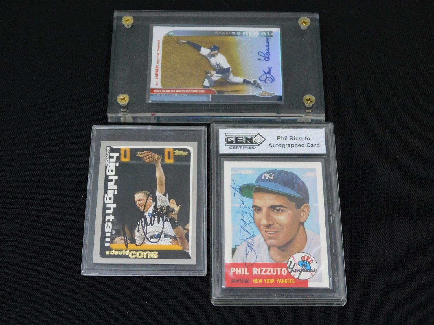 Lot of 3 Autographed Baseball Cards including David Cone, Phil Rizzuto – GEM Certified, and Topps Finest Don Larson. All items in this sale came from a single owner collection with a 30 day guarantee that the autographs are authentic. All invoices must be paid within 24 hours of the sale. There are 3 Shipping Options. Please read the Terms of Sale and Shipping Options in the Terms. If you don’t read the terms, you will be upset because you don’t know what is happening. Local pickups are at our Monmouth Junction location on Friday, Saturday and Monday ONLY! All pickups are by appointment only. Any condition issues will be listed in the description. Please read the terms for full information.