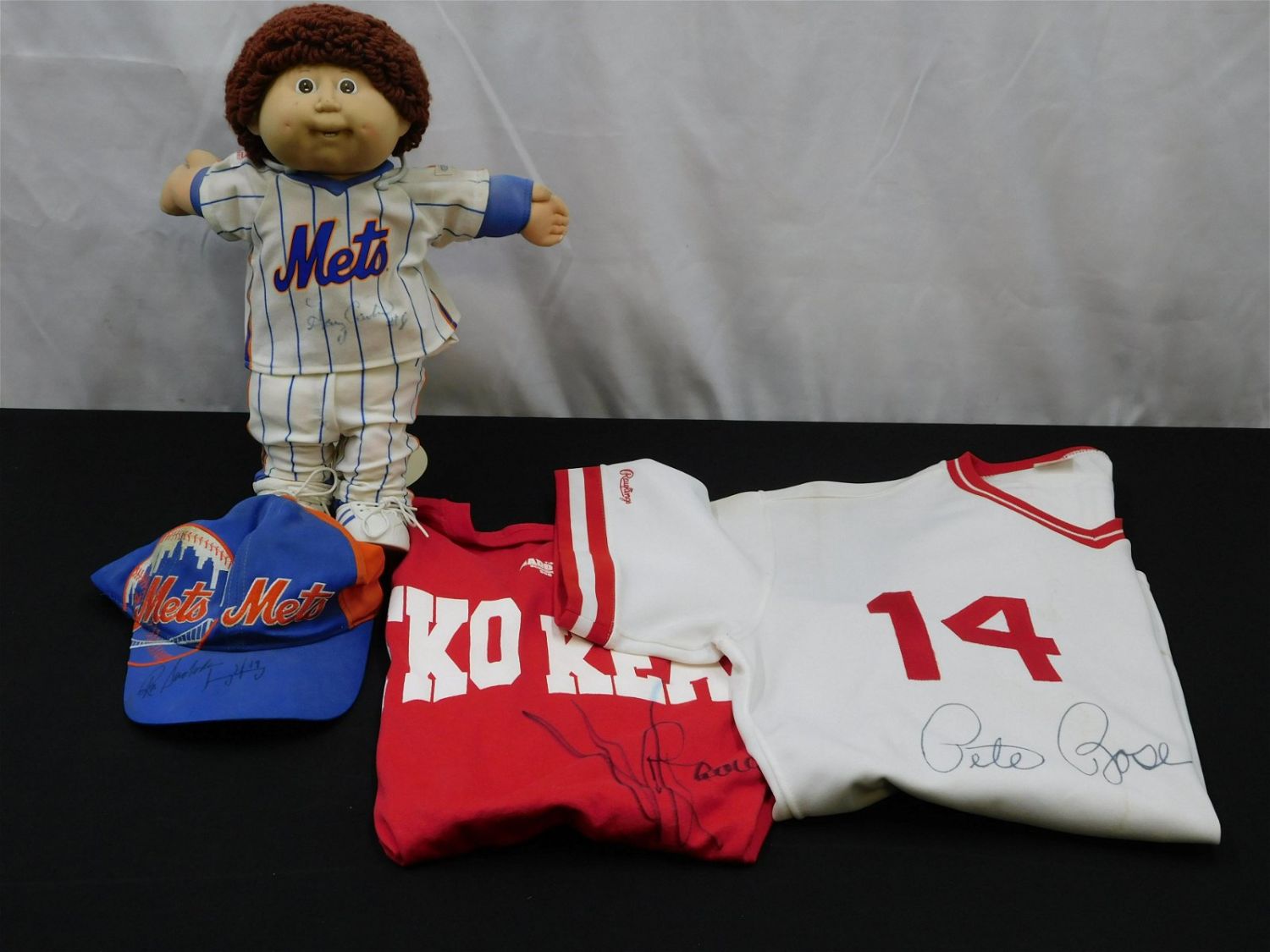 Lot of Autographed Items including Pete Rose Jersey – Stains, Boxer – Unknown, Gary Carter Autographed Cabbage Patch Doll, and Ron Swaboda Autographed Mets Hat. All items in this sale came from a single owner collection with a 30 day guarantee that the autographs are authentic. All invoices must be paid within 24 hours of the sale. There are 3 Shipping Options. Please read the Terms of Sale and Shipping Options in the Terms. If you don’t read the terms, you will be upset because you don’t know what is happening. Local pickups are at our Monmouth Junction location on Friday, Saturday and Monday ONLY! All pickups are by appointment only. Any condition issues will be listed in the description. Please read the terms for full information.