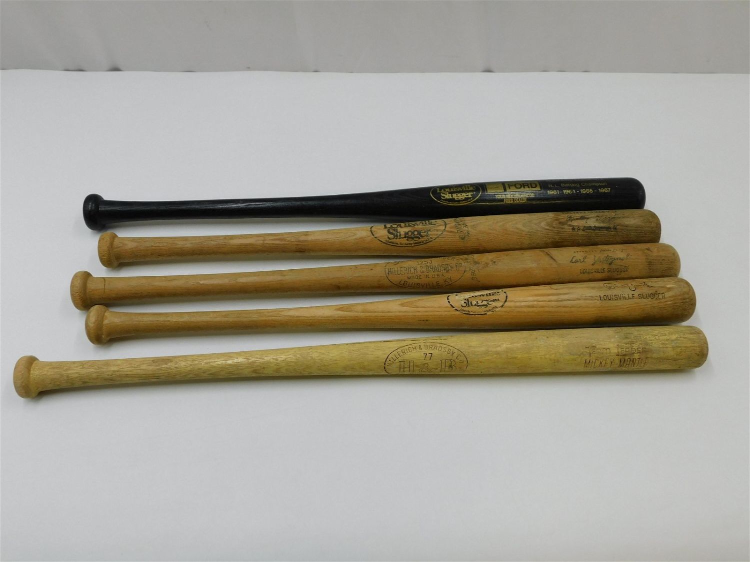 Lot of 5 Baseball Bats including Little League Louisville Slugger – 225LL, Louisville Slugger 125K, Little League Louisville Slugger Carl Yastrzemski 125J, Ford Pro Louisville Slugger Roberto Clemente Black Bat, and Little League Hillerich & Bradsby 77 Team Leader Mickey Mantle Bat All items in this sale came from a single owner collection with a 30 day guarantee that the autographs are authentic. All invoices must be paid within 24 hours of the sale. There are 3 Shipping Options. Please read the Terms of Sale and Shipping Options in the Terms. If you don’t read the terms, you will be upset because you don’t know what is happening. Local pickups are at our Monmouth Junction location on Friday, Saturday and Monday ONLY! All pickups are by appointment only. Any condition issues will be listed in the description. Please read the terms for full information.