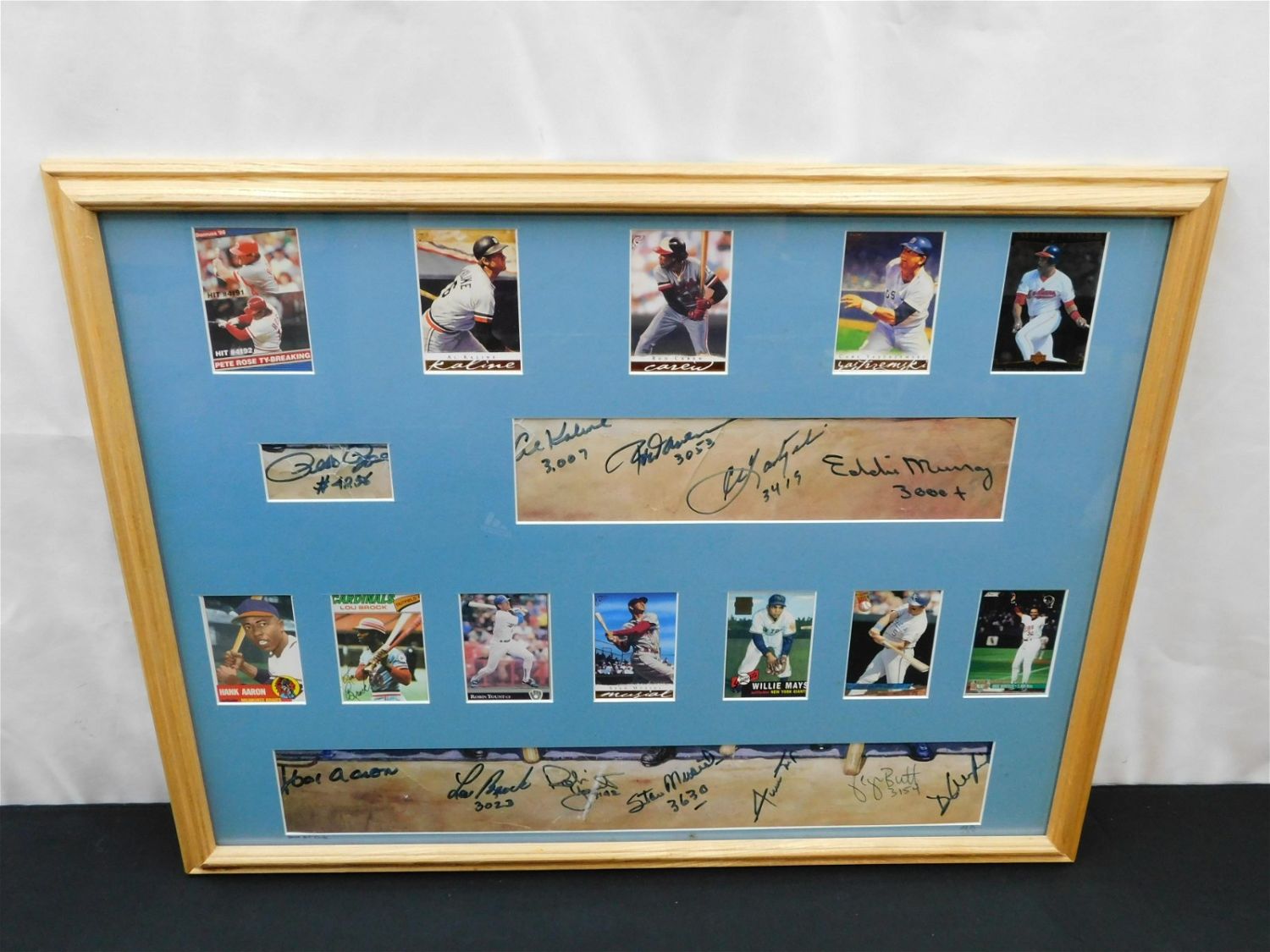 Framed Collage of 3000 Hit Club including Baseball Cards and Signatures on Poster – including Pete Rose, Al Kaline, Rod Carew, Carl Yastrzemski, Eddie Murray, Hank Aaron, Lou Brock, Robin Yount, Stan Musial, Willie Mays, George Brett, and Dave Winfield. Measures 20" tall x 25.5" wide. All items in this sale came from a single owner collection with a 30 day guarantee that the autographs are authentic. All invoices must be paid within 24 hours of the sale. There are 3 Shipping Options. Please read the Terms of Sale and Shipping Options in the Terms. If you don’t read the terms, you will be upset because you don’t know what is happening. Local pickups are at our Monmouth Junction location on Friday, Saturday and Monday ONLY! All pickups are by appointment only. Any condition issues will be listed in the description. Please read the terms for full information.