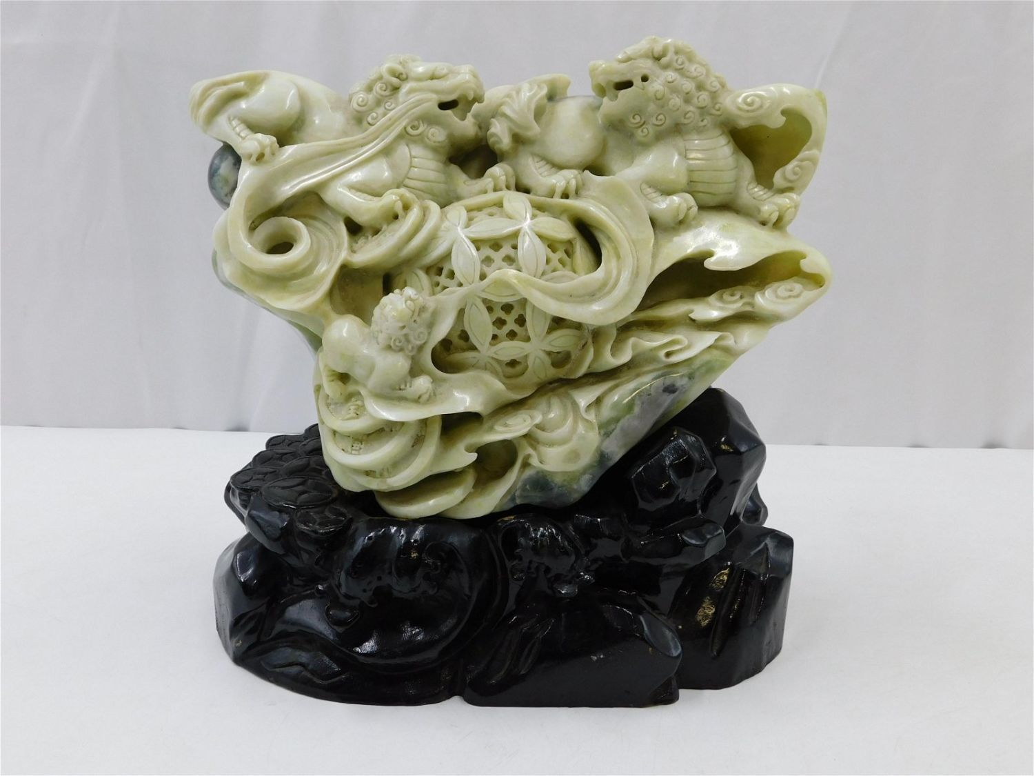 Hand Carved Chinese Hard Stone Foo Dog Figure. Has Three Dimensional Ball. Possibly Jade – Unsure. One edge on decoration may be chipped – hard to tell. Comes on wooden base. Measures 12" tall x 14" wide x 7" deep. Has wear consistent with age. Any questions, contact us. All invoices must be paid within 24 hours of the sale. There are 3 Shipping Options. Please read the Terms of Sale and Shipping Options in the Terms. If you don’t read the terms, you will be upset because you don’t know what is happening. Local pickups are at our Monmouth Junction location on Thursday, Friday, Saturday and Monday ONLY! All pickups are by appointment only. Any major condition issues will be listed in the description. Please read the terms for full information.