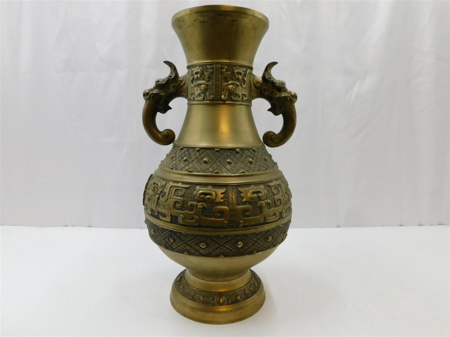 Chinese Brass Floor Vase with Archaic Dragon Handles. Measures 24" tall x 14" wide. Has wear consistent with age. Any questions, contact us. All invoices must be paid within 24 hours of the sale. There are 3 Shipping Options. Please read the Terms of Sale and Shipping Options in the Terms. If you don’t read the terms, you will be upset because you don’t know what is happening. Local pickups are at our Monmouth Junction location on Thursday, Friday, Saturday and Monday ONLY! All pickups are by appointment only. Any major condition issues will be listed in the description. Please read the terms for full information.