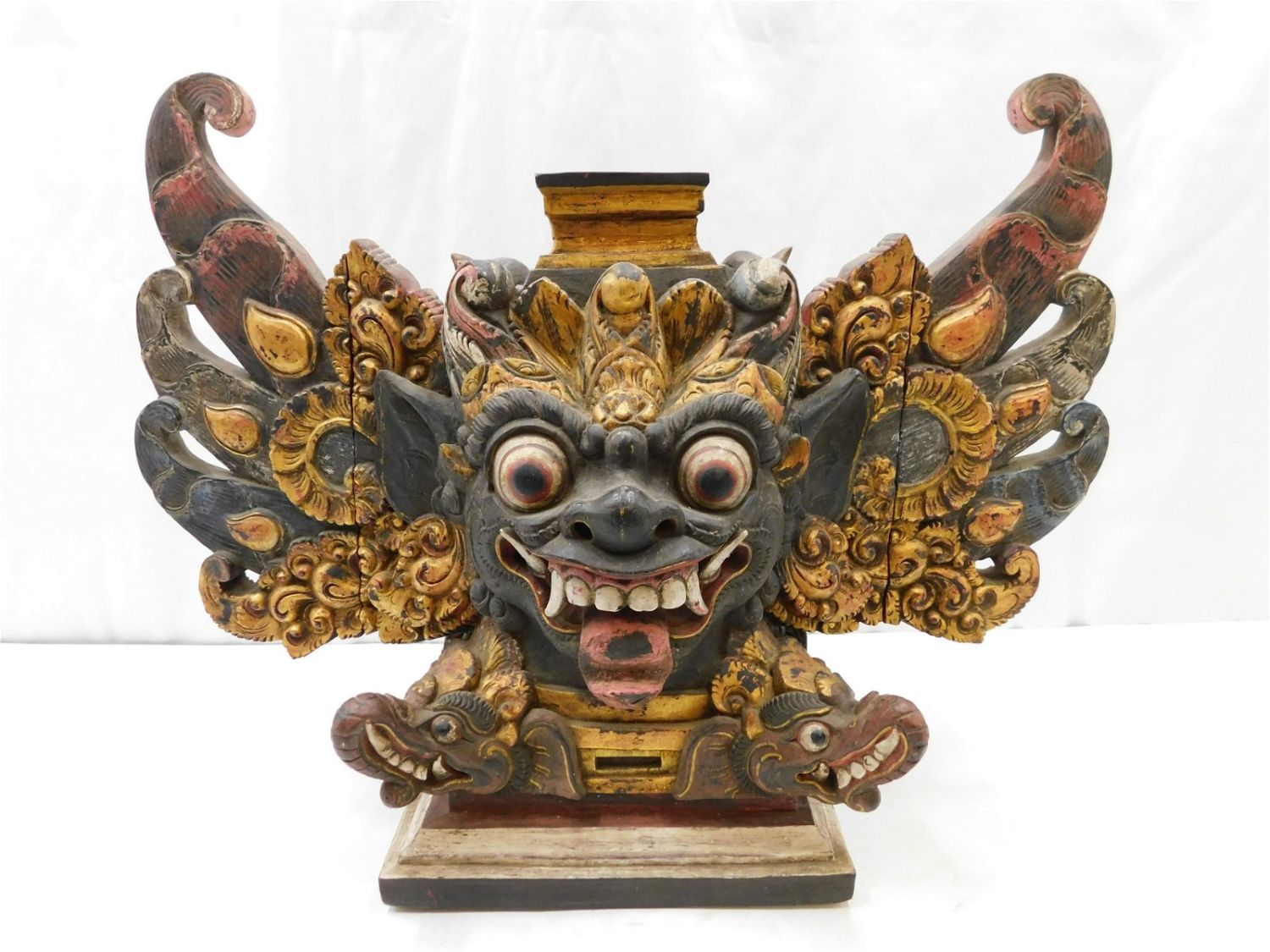 Hand Carved Hand Painted Wooden Balinese Double Sided Mask/Face with Wings Statue. Has wear consistent with age. Any questions, contact us. Measures 27" tall x 21" wide x 12" deep. All invoices must be paid within 24 hours of the sale. There are 3 Shipping Options. Please read the Terms of Sale and Shipping Options in the Terms. If you don’t read the terms, you will be upset because you don’t know what is happening. Local pickups are at our Monmouth Junction location on Thursday, Friday, Saturday and Monday ONLY! All pickups are by appointment only. Any major condition issues will be listed in the description. Please read the terms for full information.