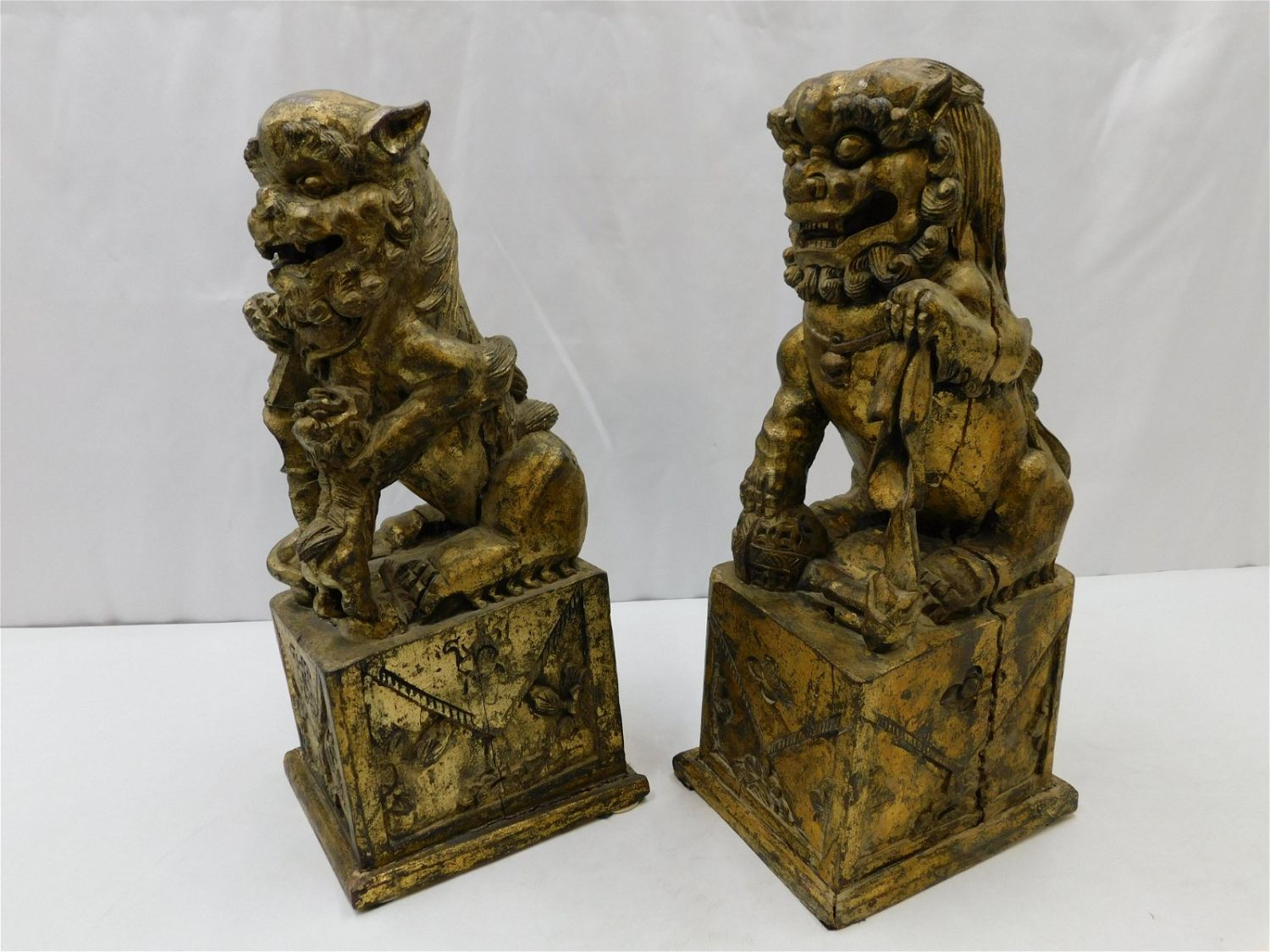 Pair of Hand Carved Foo Dog Statues on Pedestal. Both have cracks in the middle. They are similar but not identical. Measures 19" tall x 7" wide x 9" deep. Has wear consistent with age. Any questions, contact us. All invoices must be paid within 24 hours of the sale. There are 3 Shipping Options. Please read the Terms of Sale and Shipping Options in the Terms. If you don’t read the terms, you will be upset because you don’t know what is happening. Local pickups are at our Monmouth Junction location on Thursday, Friday, Saturday and Monday ONLY! All pickups are by appointment only. Any major condition issues will be listed in the description. Please read the terms for full information.