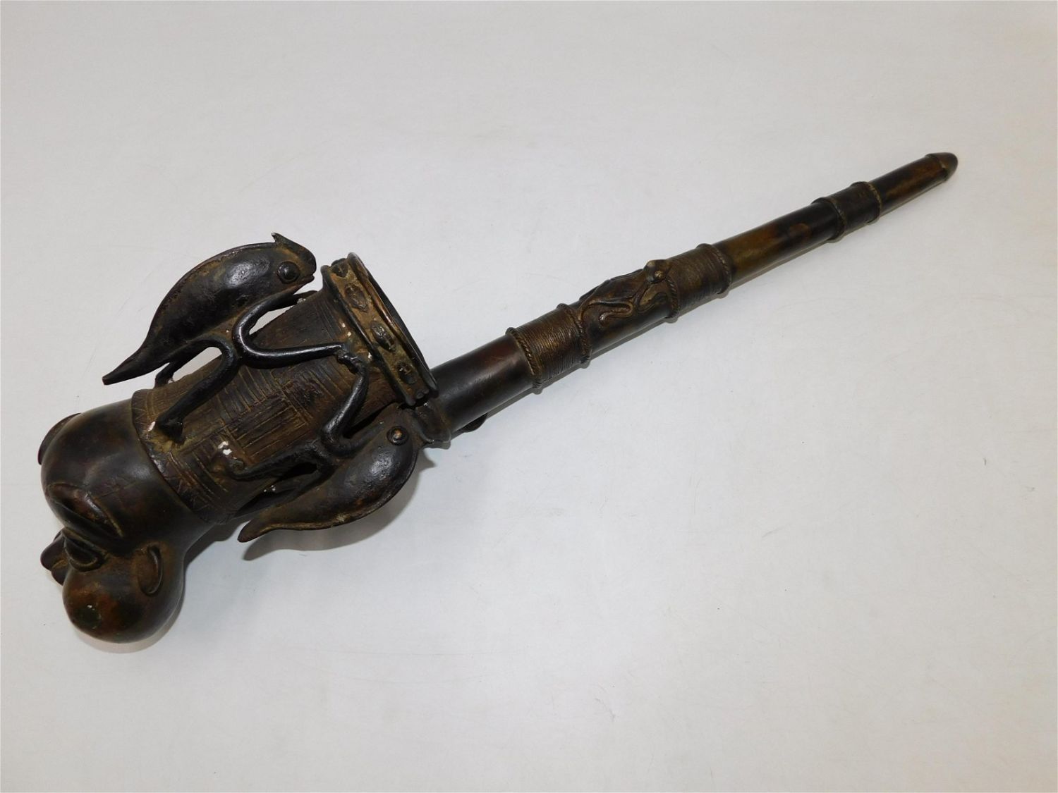 African Tribal Art Bronze Oversized Figural Pipe. Has animal decoration. In the manner of Benin. Measures 27" long x 7" wide x 8" deep. Has wear consistent with age. Any questions, contact us. All invoices must be paid within 24 hours of the sale. There are 3 Shipping Options. Please read the Terms of Sale and Shipping Options in the Terms. If you don’t read the terms, you will be upset because you don’t know what is happening. Local pickups are at our Monmouth Junction location on Thursday, Friday, Saturday and Monday ONLY! All pickups are by appointment only. Any major condition issues will be listed in the description. Please read the terms for full information.