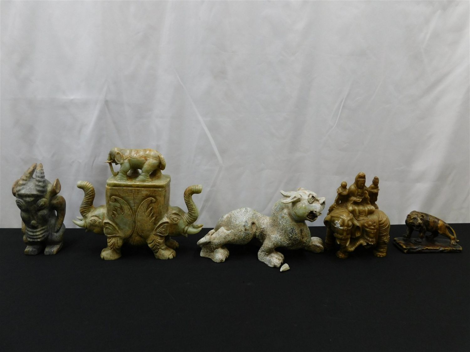 Lot of 5 Hand Carved Hard Stone and Soapstone Figures. Includes Elephant Box – one tusk appears to be repaired, Tiger – Ear has chip, Elephant with Goddesses – Has chipping to eye, Large Dragon – Ear needs repair, and Other figure in good condition. Largest measures 9" tall x 11" wide x 3" deep. Has wear consistent with age. Any questions, contact us. All invoices must be paid within 24 hours of the sale. There are 3 Shipping Options. Please read the Terms of Sale and Shipping Options in the Terms. If you don’t read the terms, you will be upset because you don’t know what is happening. Local pickups are at our Monmouth Junction location on Thursday, Friday, Saturday and Monday ONLY! All pickups are by appointment only. Any major condition issues will be listed in the description. Please read the terms for full information.