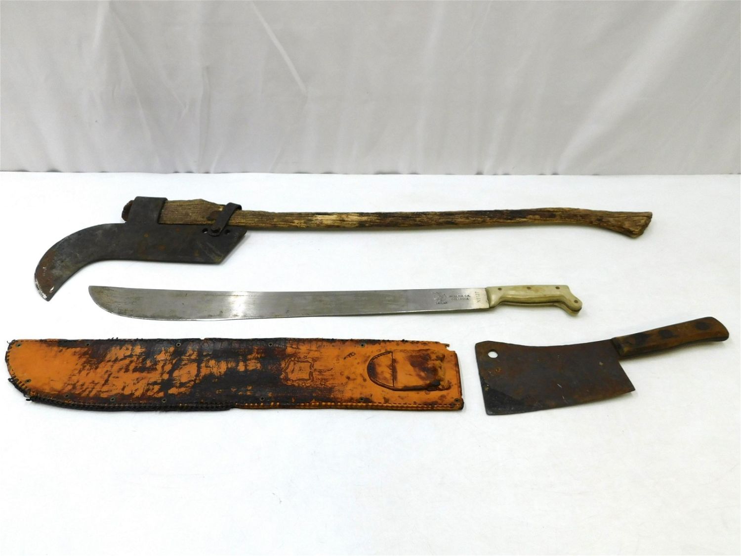 Lot of 3 Weapons including Galvin Machete No. 127, Butcher Knife, and Battle Axe. Largest measures 40.5" long. Has wear consistent with age. Any questions, contact us. All invoices must be paid within 24 hours of the sale. There are 3 Shipping Options. Please read the Terms of Sale and Shipping Options in the Terms. If you don’t read the terms, you will be upset because you don’t know what is happening. Local pickups are at our Monmouth Junction location on Thursday, Friday, Saturday and Monday ONLY! All pickups are by appointment only. Any major condition issues will be listed in the description. Please read the terms for full information.