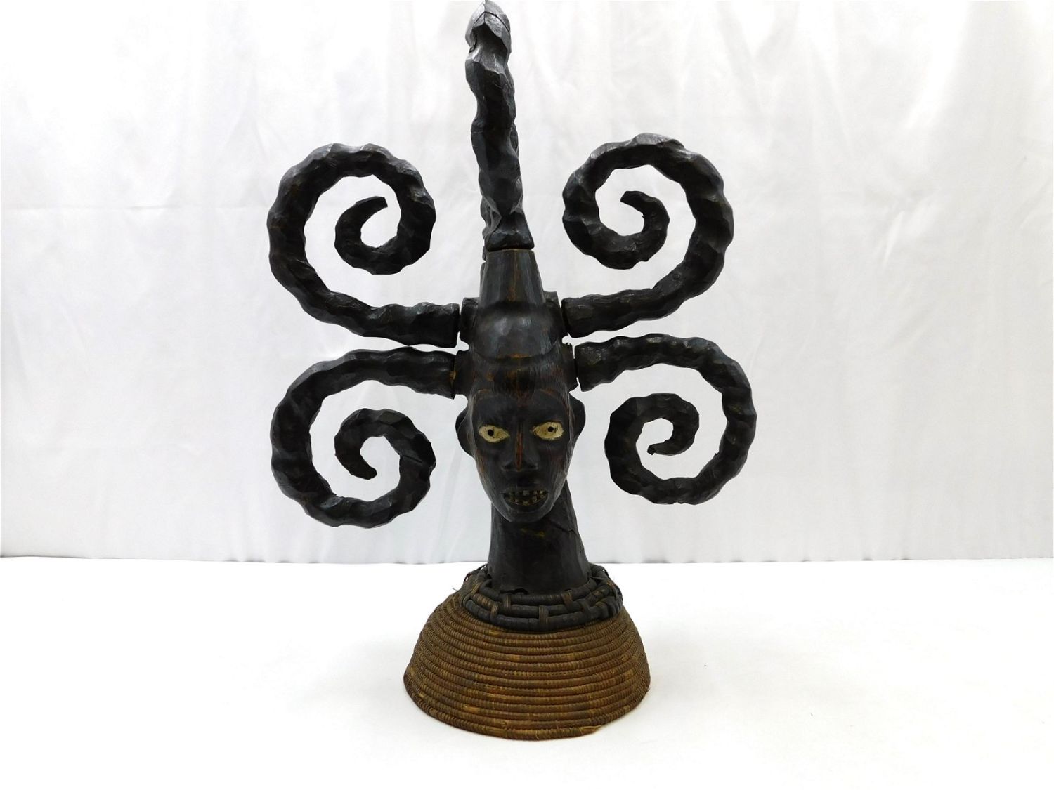 African Tribal Art Headdress. In the manner of Ekoi. Double Faced. Hand painted. Measures 23" tall x 19" wide x 19" deep. Has wear consistent with age. Any questions, contact us. All invoices must be paid within 24 hours of the sale. There are 3 Shipping Options. Please read the Terms of Sale and Shipping Options in the Terms. If you don’t read the terms, you will be upset because you don’t know what is happening. Local pickups are at our Monmouth Junction location on Thursday, Friday, Saturday and Monday ONLY! All pickups are by appointment only. Any major condition issues will be listed in the description. Please read the terms for full information.