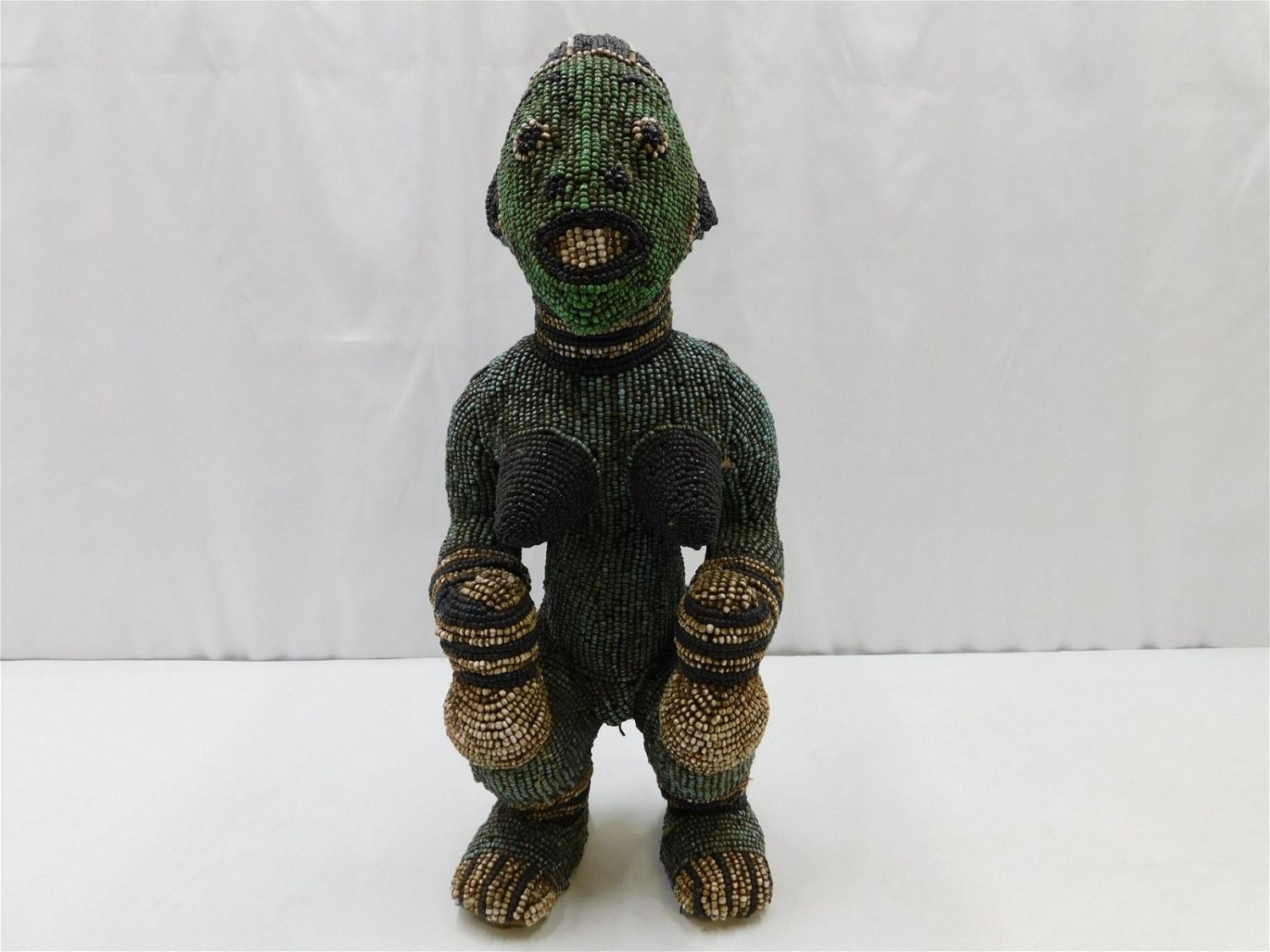 African Tribal Art Statue. In the manner of Bamileke. Fully Beaded. Measures 21" tall x 9" wide x 7" deep. Has wear consistent with age. Any questions, contact us. All invoices must be paid within 24 hours of the sale. There are 3 Shipping Options. Please read the Terms of Sale and Shipping Options in the Terms. If you don’t read the terms, you will be upset because you don’t know what is happening. Local pickups are at our Monmouth Junction location on Thursday, Friday, Saturday and Monday ONLY! All pickups are by appointment only. Any major condition issues will be listed in the description. Please read the terms for full information.