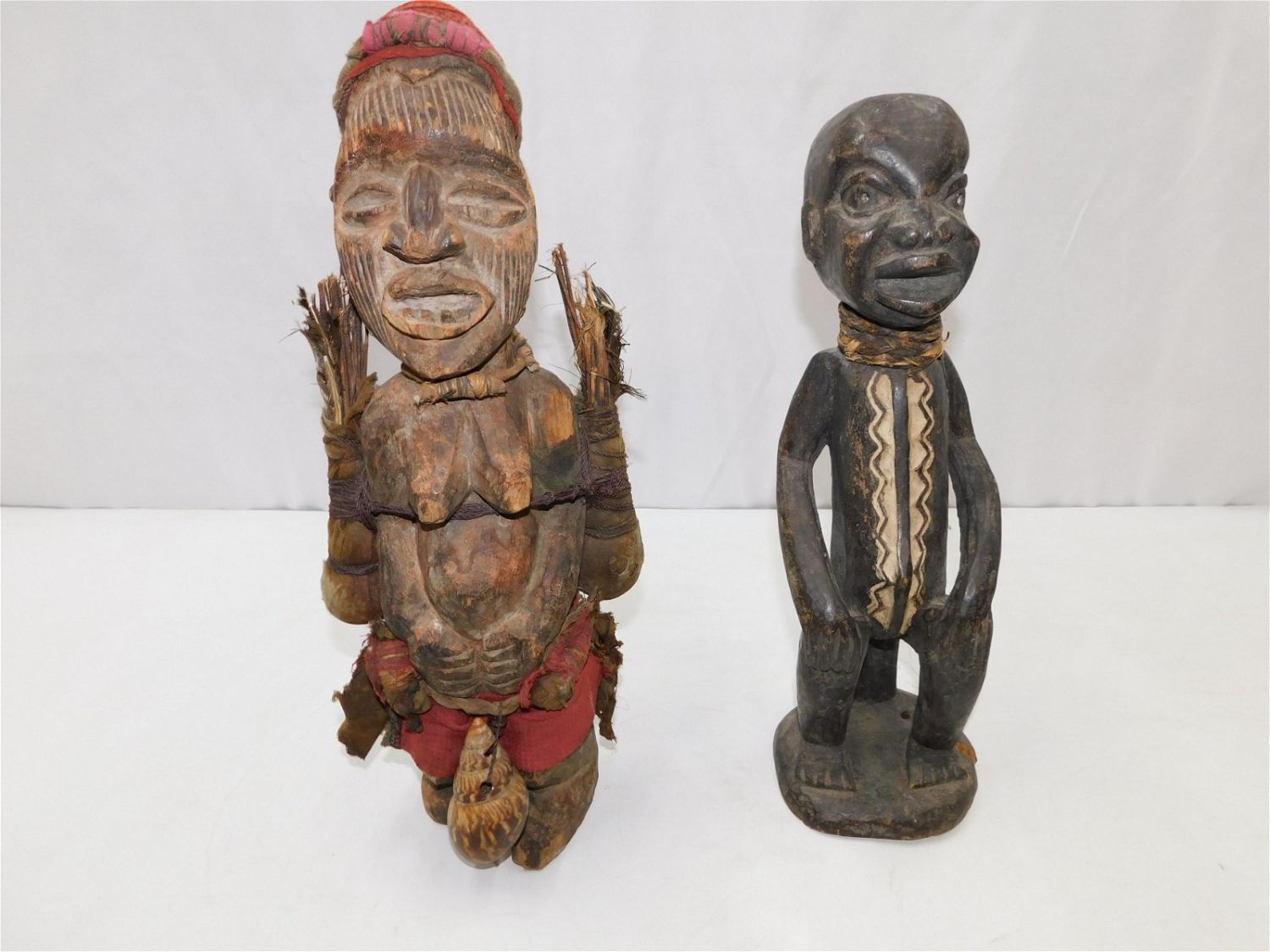 Lot of 2 African Tribal Art Figures. Includes one power figure. The power figure has cowrie shell decoration and burlap – Does have heavy damage to left ear and other has cracks throughout. Measures 18" tall x 7" wide. Has wear consistent with age. Any questions, contact us. All invoices must be paid within 24 hours of the sale. There are 3 Shipping Options. Please read the Terms of Sale and Shipping Options in the Terms. If you don’t read the terms, you will be upset because you don’t know what is happening. Local pickups are at our Monmouth Junction location on Thursday, Friday, Saturday and Monday ONLY! All pickups are by appointment only. Any major condition issues will be listed in the description. Please read the terms for full information.