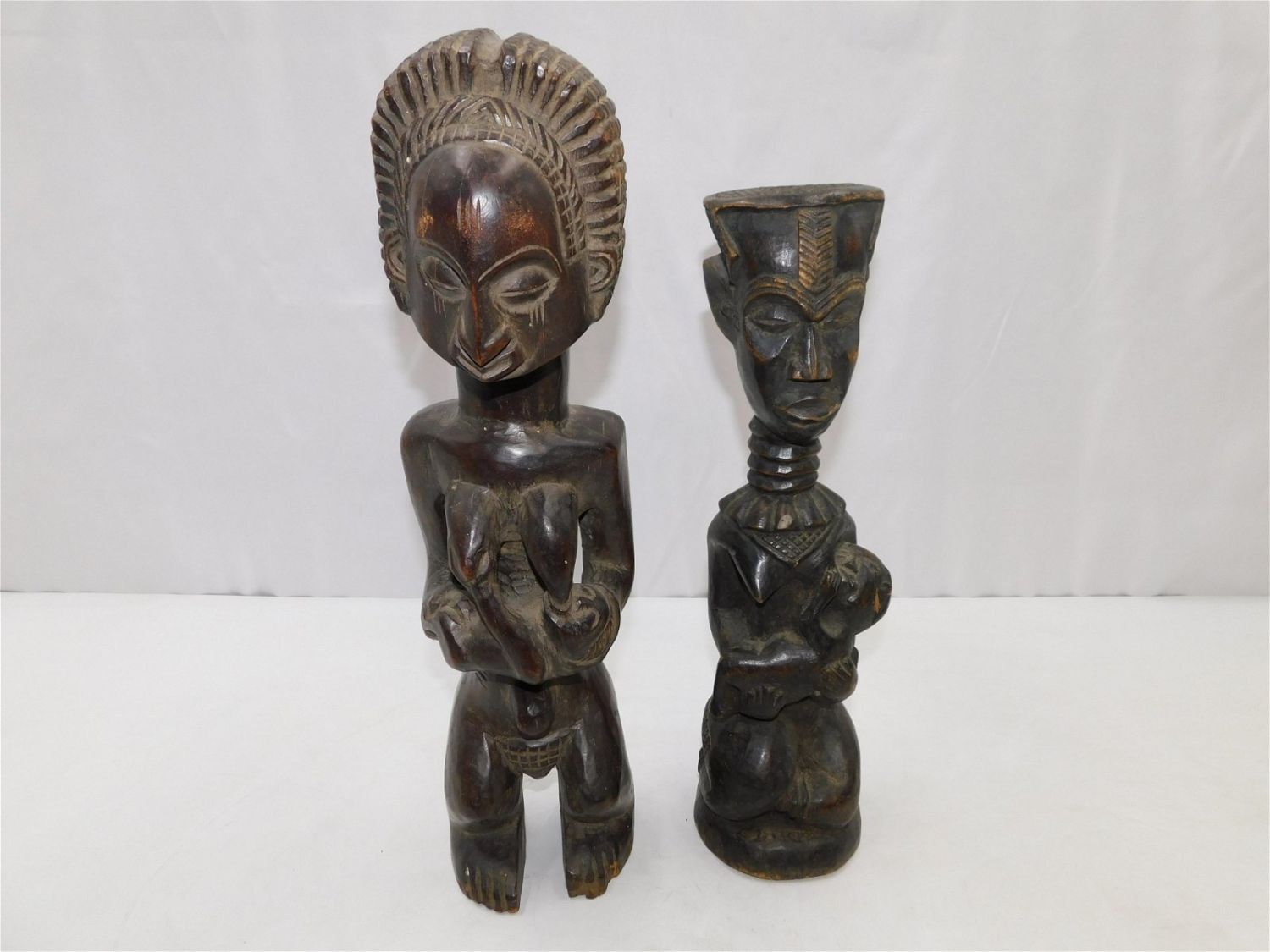 Lot of 2 African Tribal Art Statues depicting woman with child. Larger one has cracking at feet and smaller one has cracking throughout. Largest measures 20" tall x 6" wide. Has wear consistent with age. Any questions, contact us. All invoices must be paid within 24 hours of the sale. There are 3 Shipping Options. Please read the Terms of Sale and Shipping Options in the Terms. If you don’t read the terms, you will be upset because you don’t know what is happening. Local pickups are at our Monmouth Junction location on Thursday, Friday, Saturday and Monday ONLY! All pickups are by appointment only. Any major condition issues will be listed in the description. Please read the terms for full information.